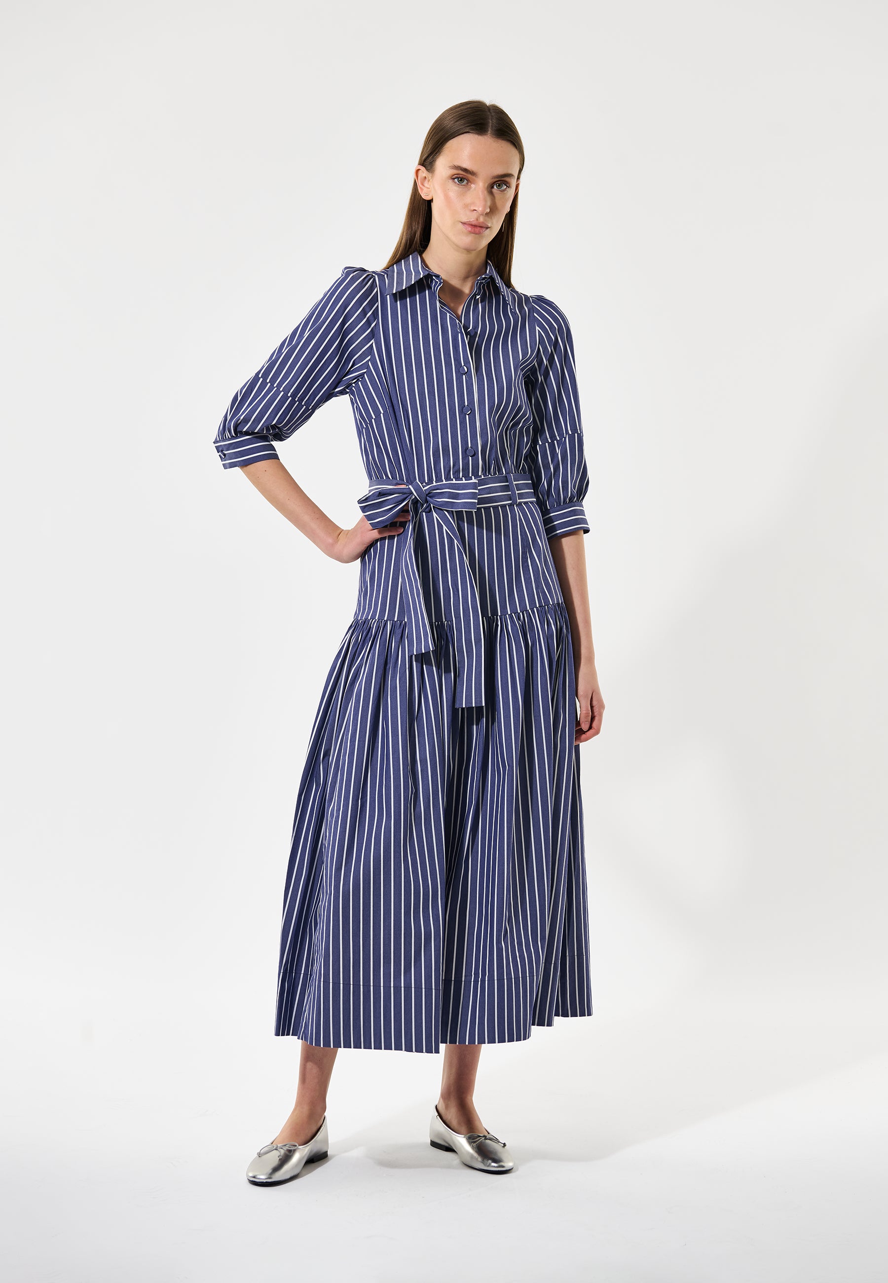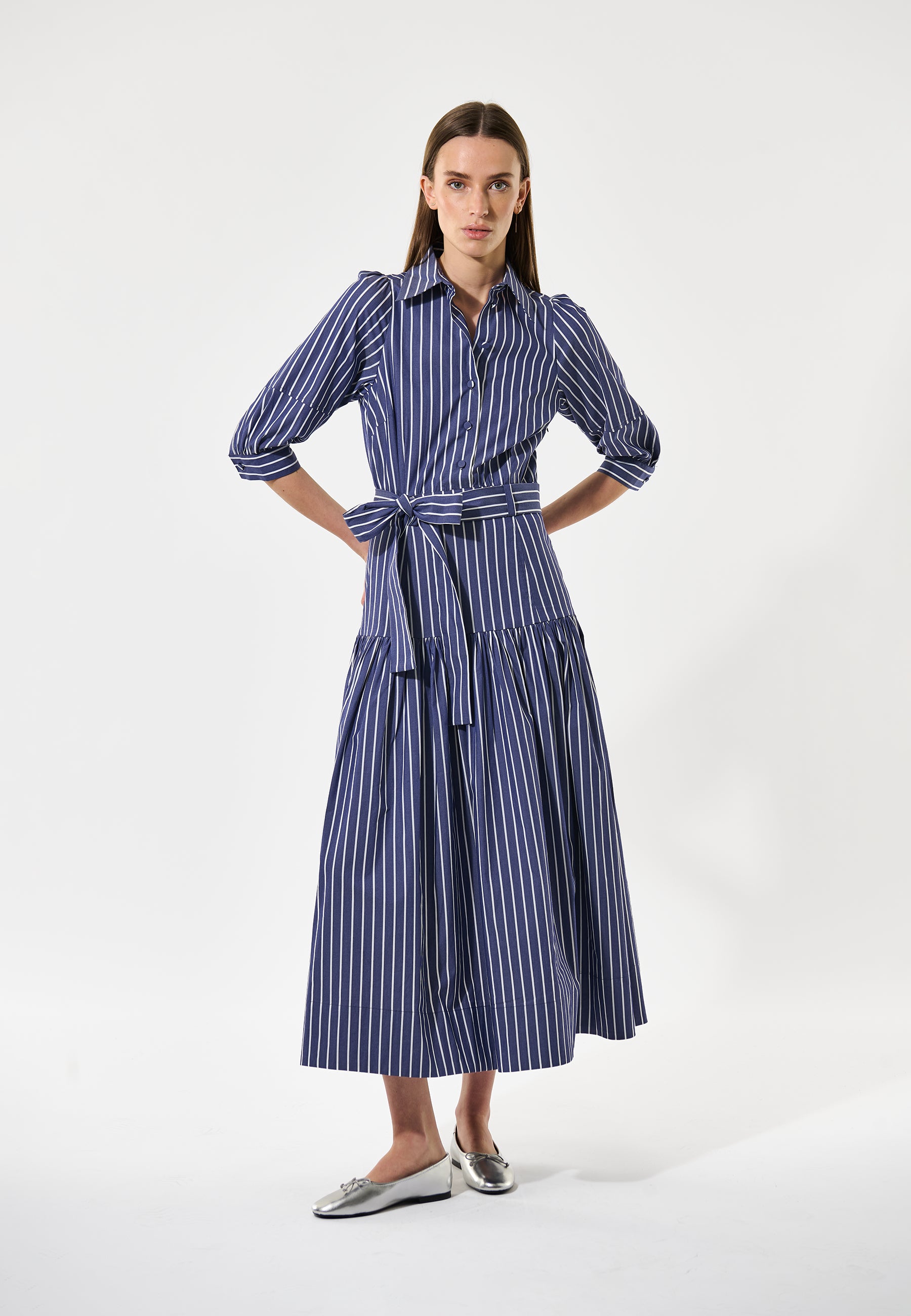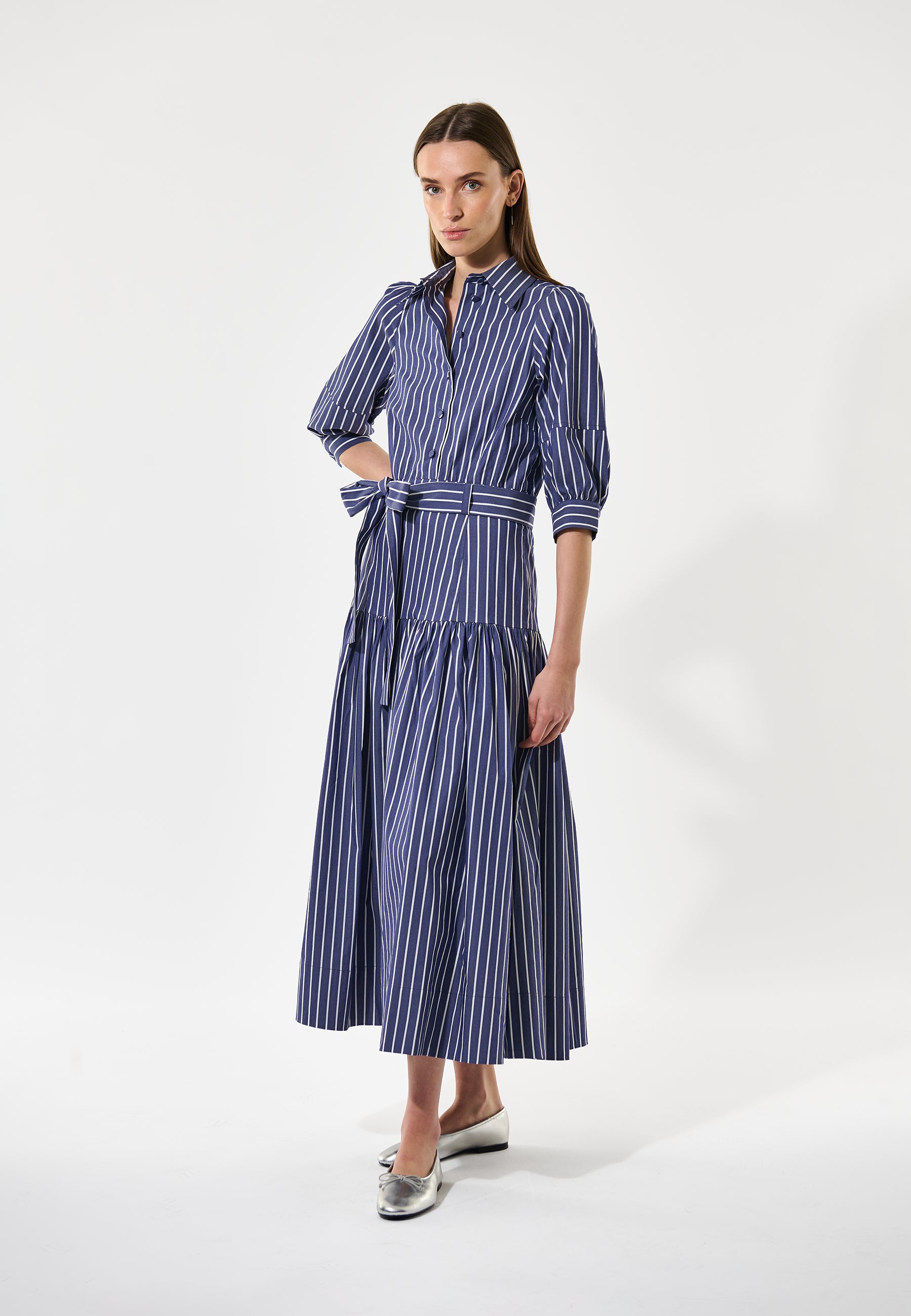 A fitted top with neat shirt collar and half placket with 3/4 length sleeves opens into a wider skirt below a waist which is defined by a self fabric tie belt. The dress fastens by a zip at the side.