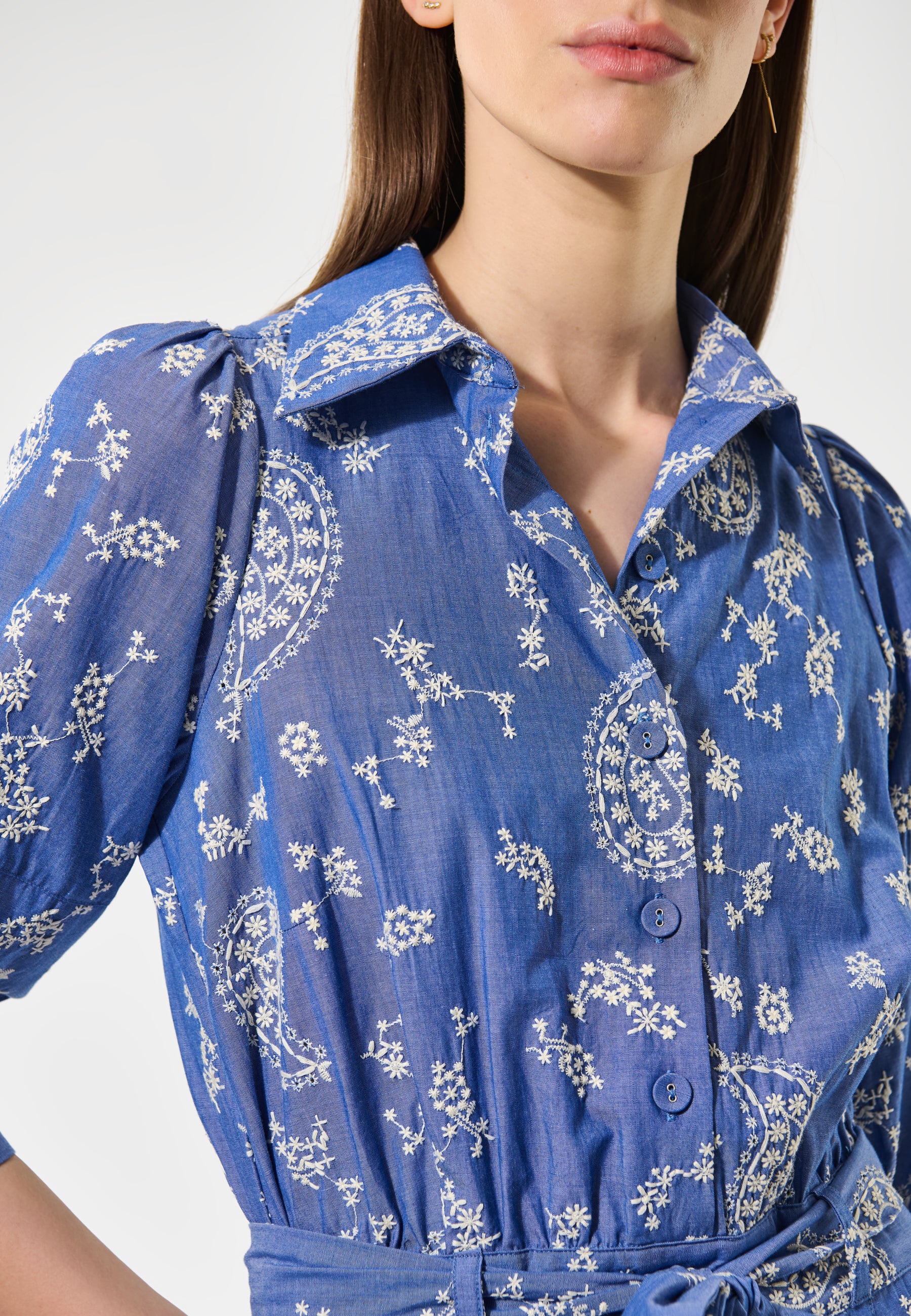 A fitted top with neat shirt collar and half placket with 3/4 length sleeves opens into a wider skirt below a waist which is defined by a self fabric tie belt. The dress fastens by a zip at the side.