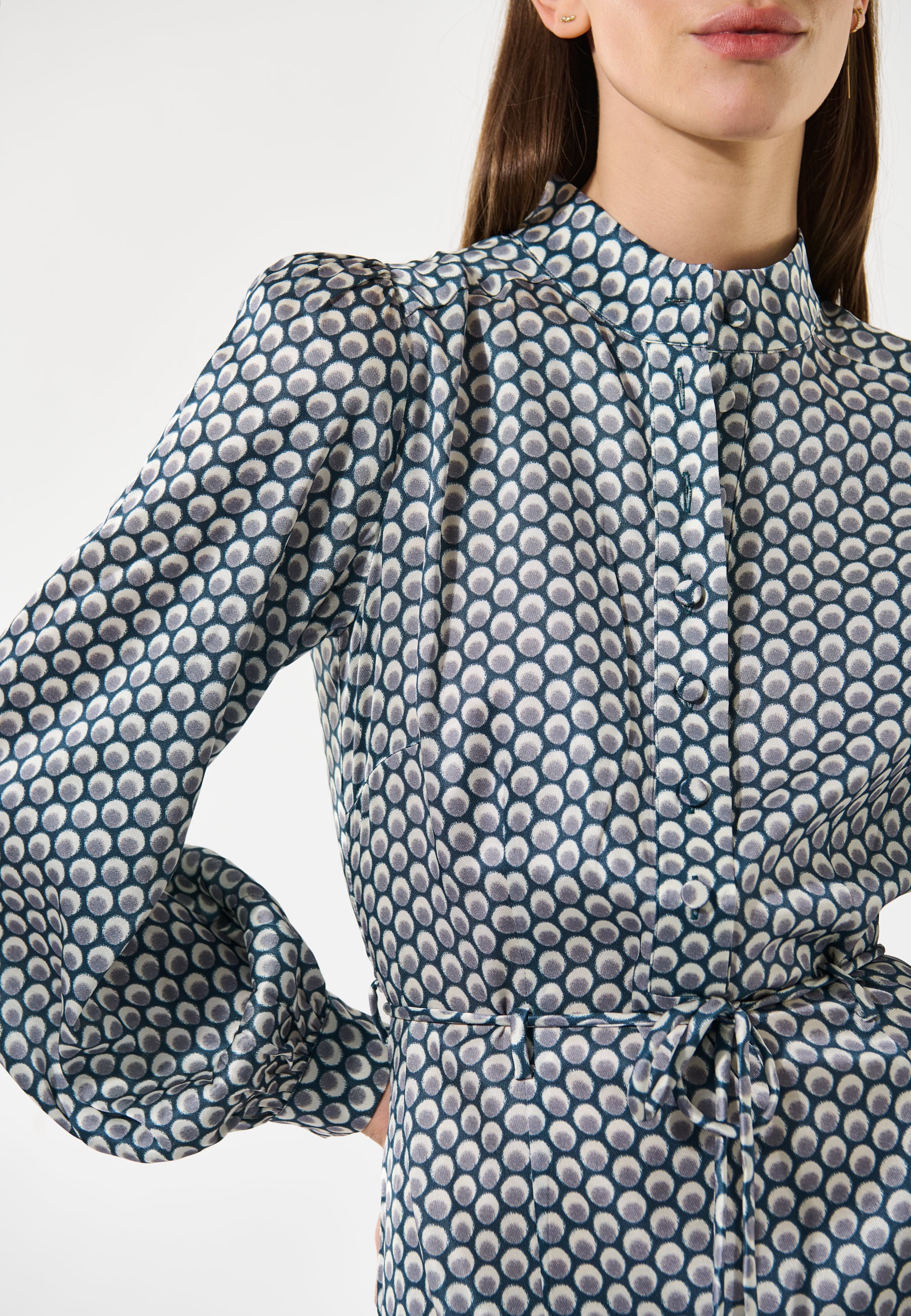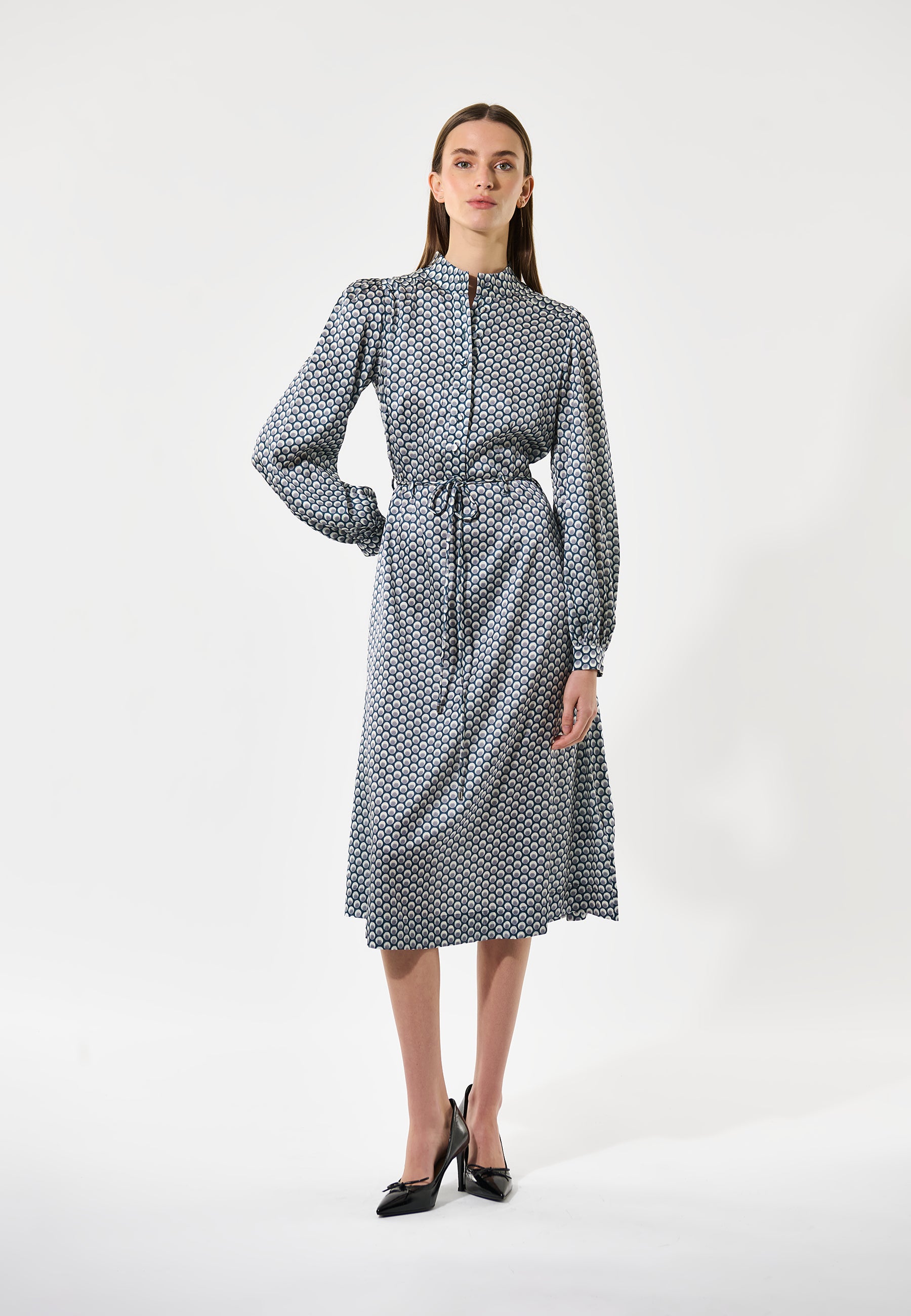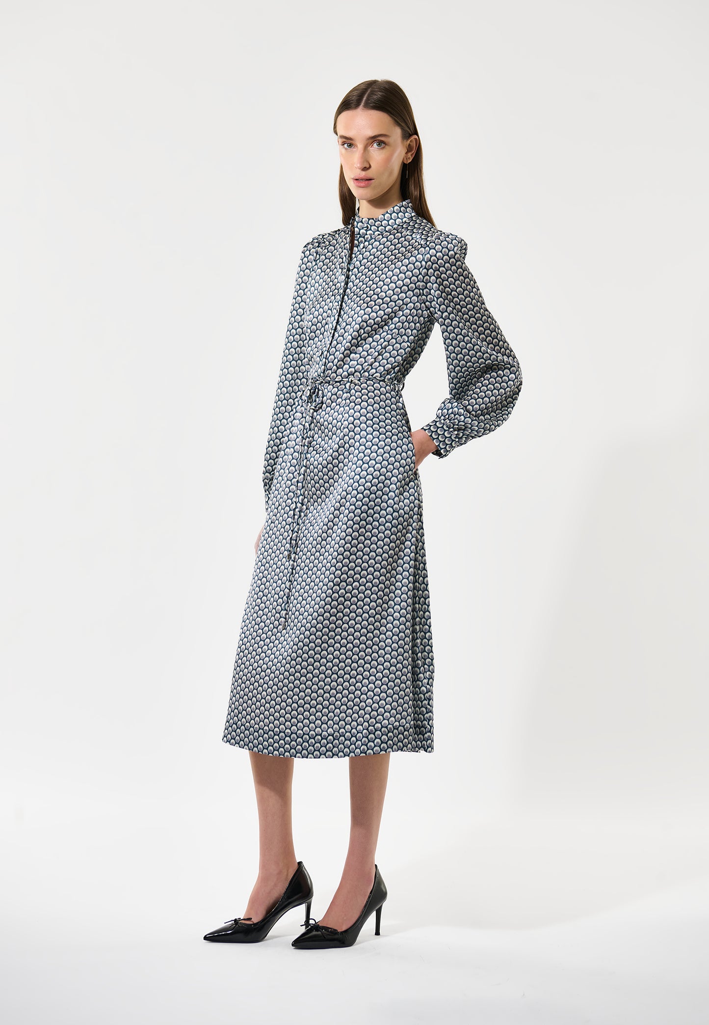 Fitted at the body and then flaring out to an A-line mid calf length skirt, this dress in silk printed with a geometric design is flattering and chic. It has a stand collar, full sleeves that end with a buttoned cuff and a self fabric belt finished with metal ends. The dress is fastened with a hidden side zip and a buttoned front placket.
