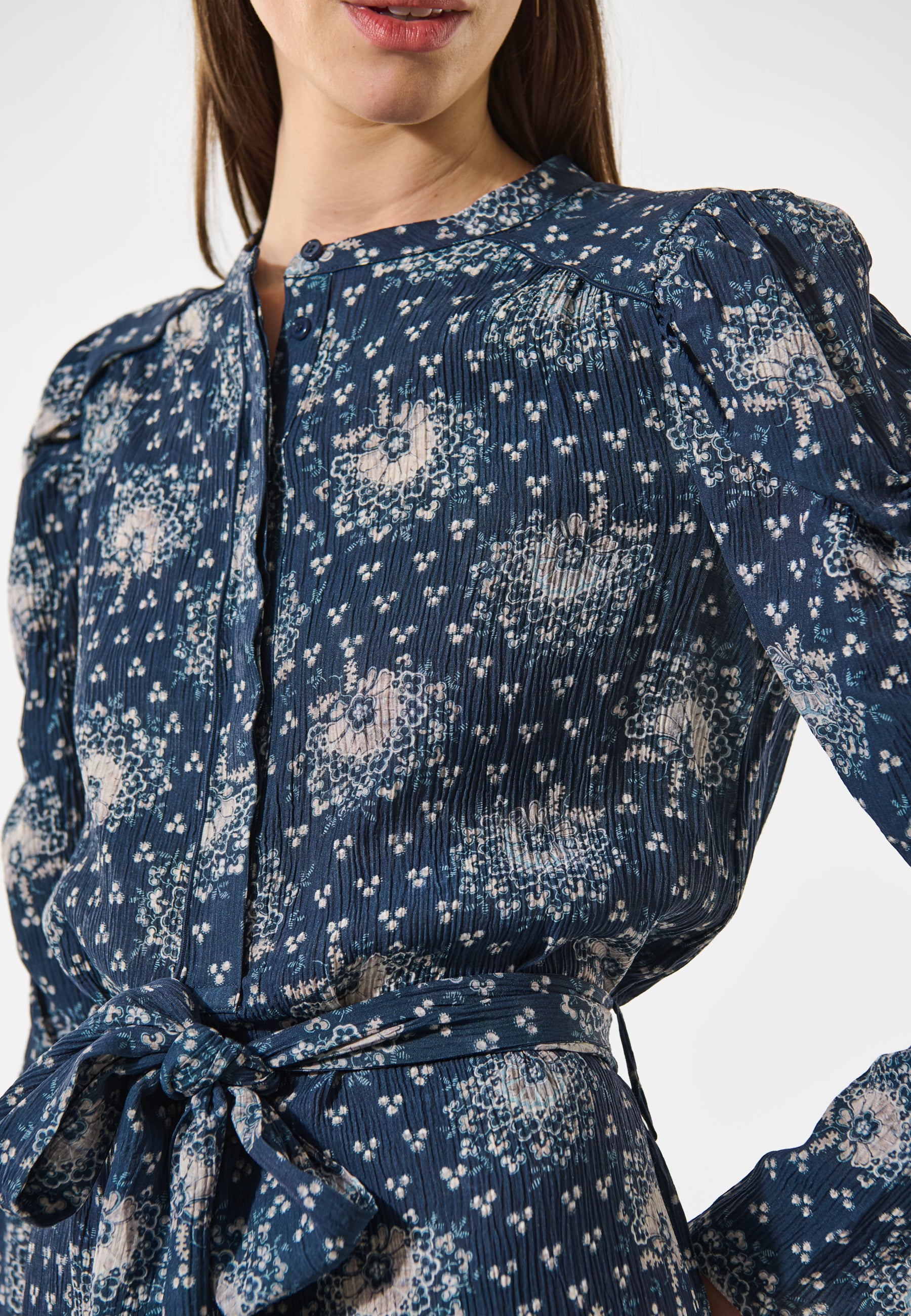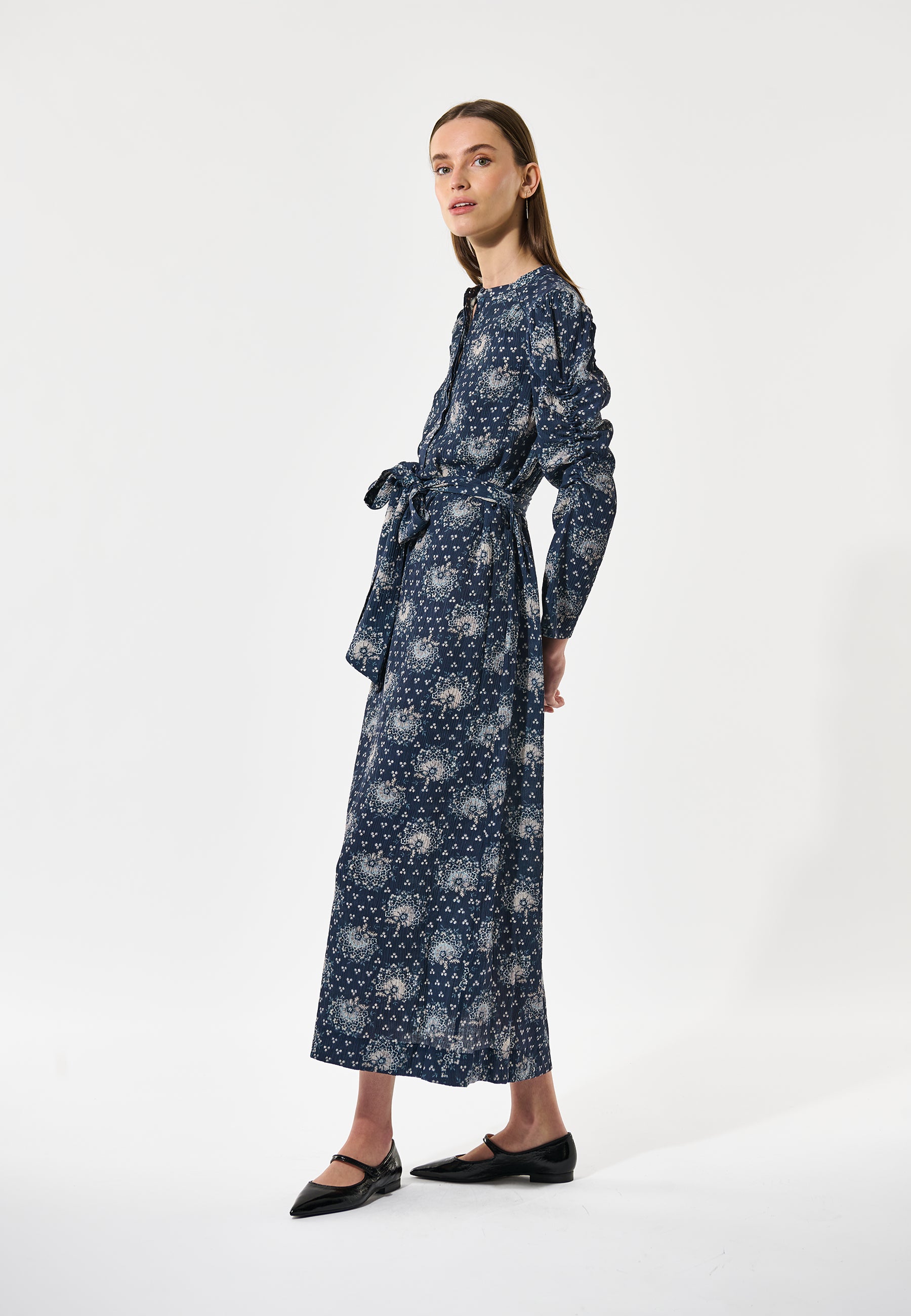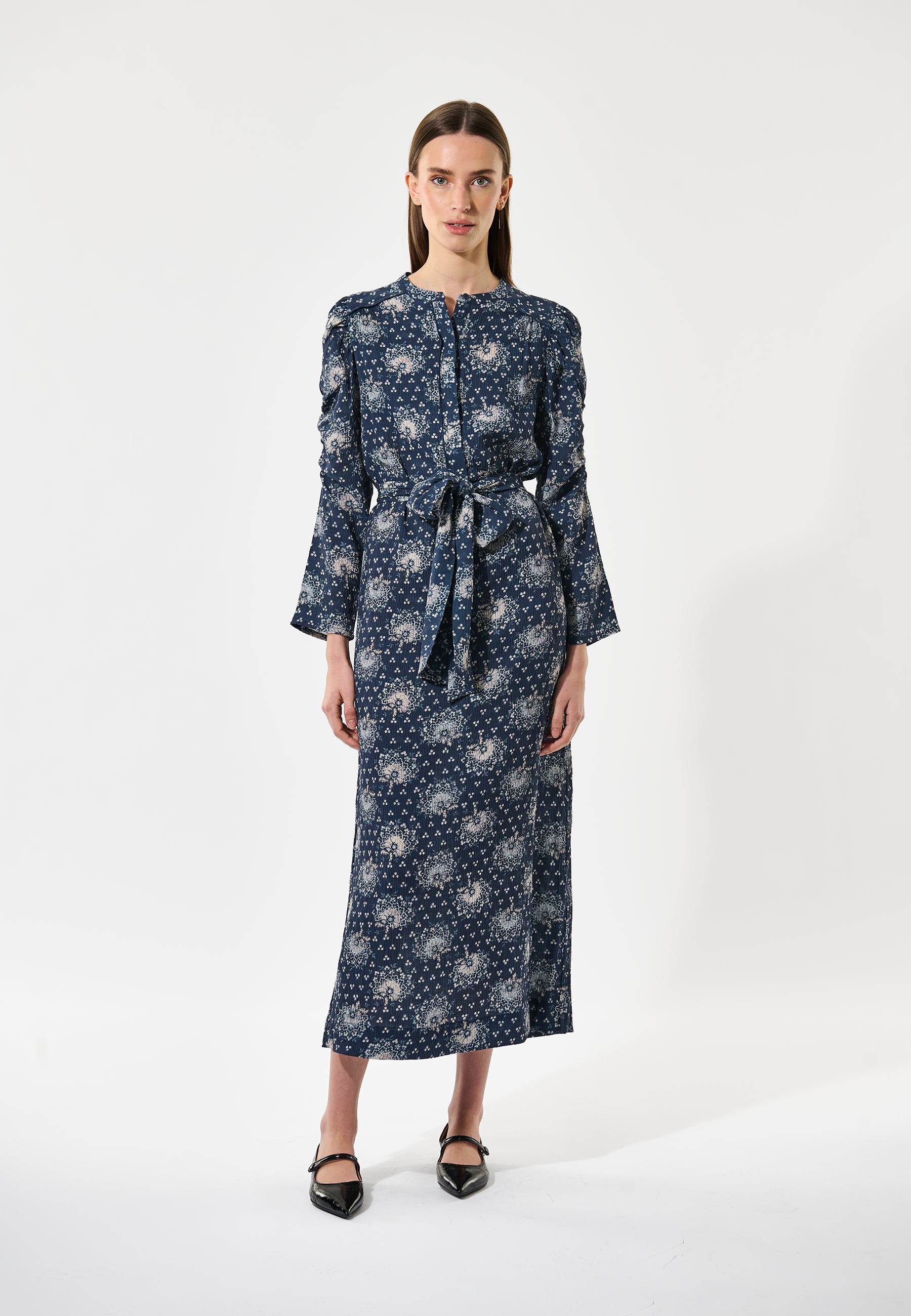 Delicate ruching on the sleeves of this regular fit mid calf length dress adds an unusual detail. A round collar tops a button placket with piping detail whilst a self fabric belt can be used to pull the dress into the waist.