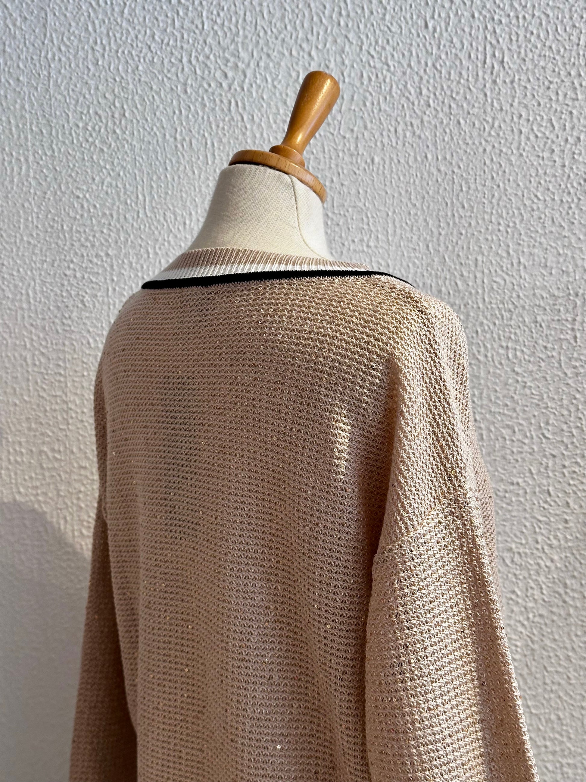 Faber's sporty style open knit jumper in an elegant champagne gold, cotton mix. Featuring an open v-nek neckline with a sporty stripe rib, 3/4 length sleeves and sporty stipe detail on the cuffs and bottom hem. Small gold sequins all over.