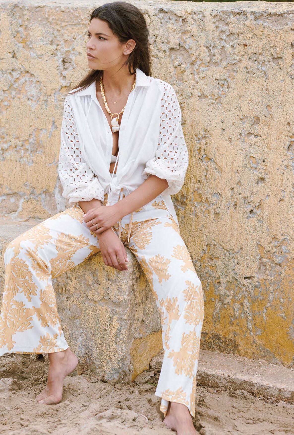 Cream cotton shirt , broderie anglaise long sleeves , collared with tassel ties , back placket in broderie anglaise