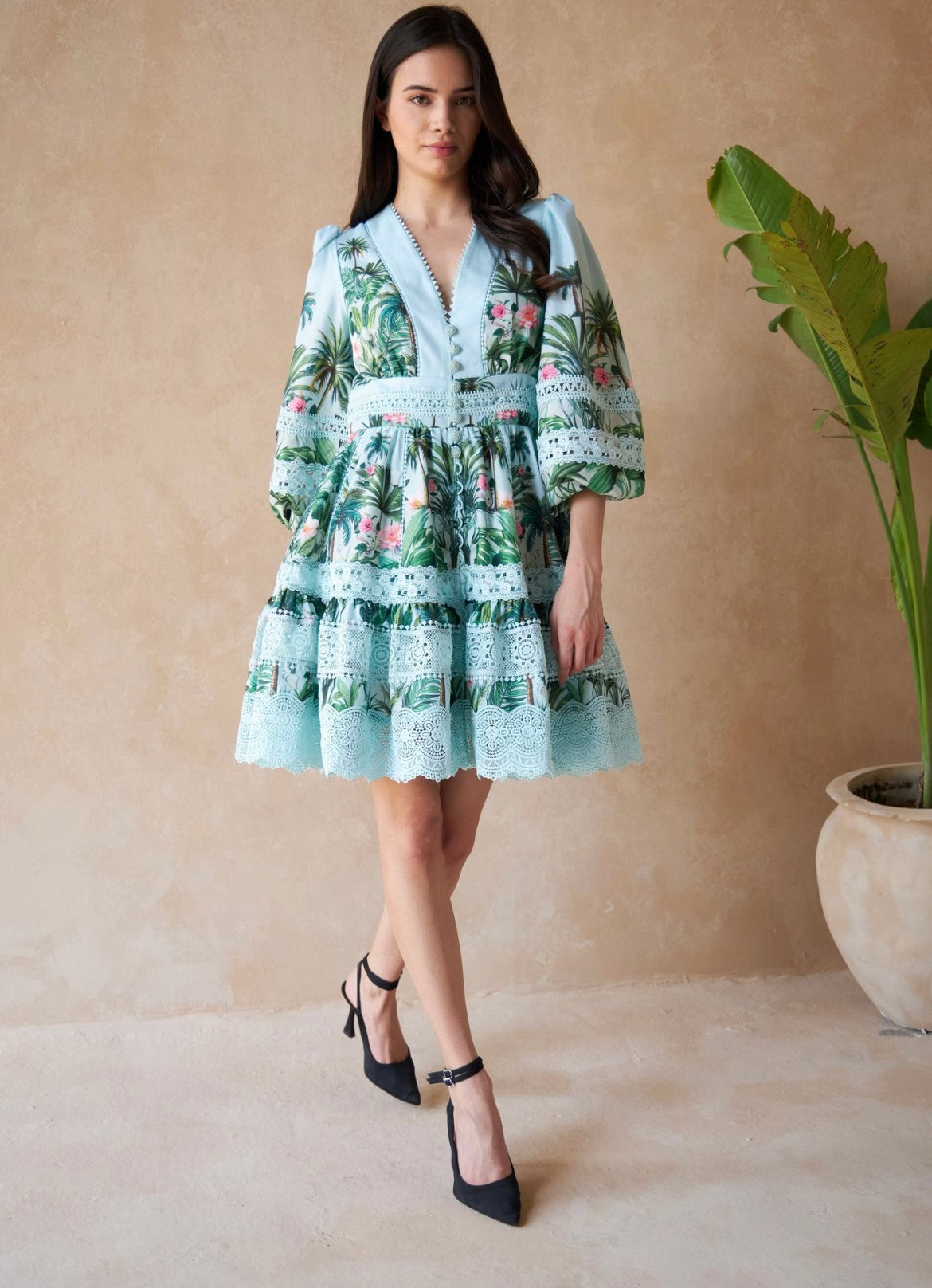 Dress to impress in Inoa's Palm Green Bavarian Linen Dress! Made from premium poly linen with a lovely floral palm print, you'll feel effortlessly stylish. The deep v-neckline, puff sleeves, and wide waistband add flattering details. Embroidered lace accents and buttons give a touch of elegance. Perfect for any occasion with a concealed back zip and lined for comfort.