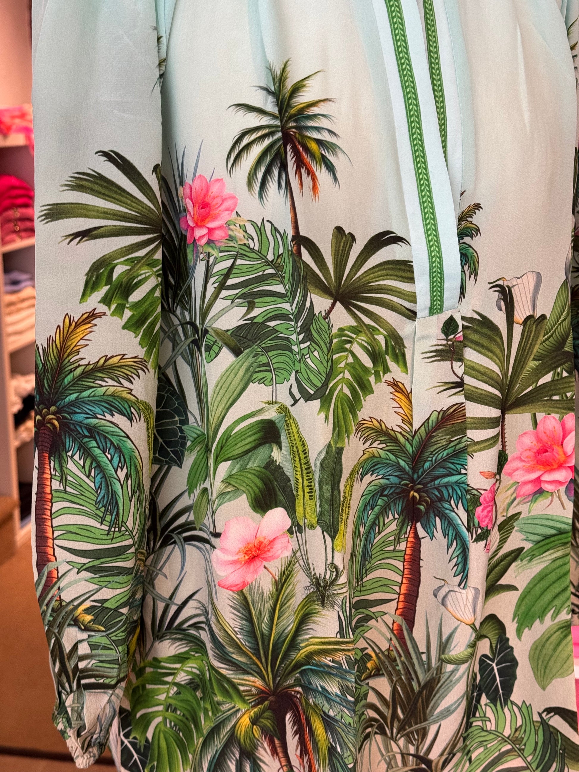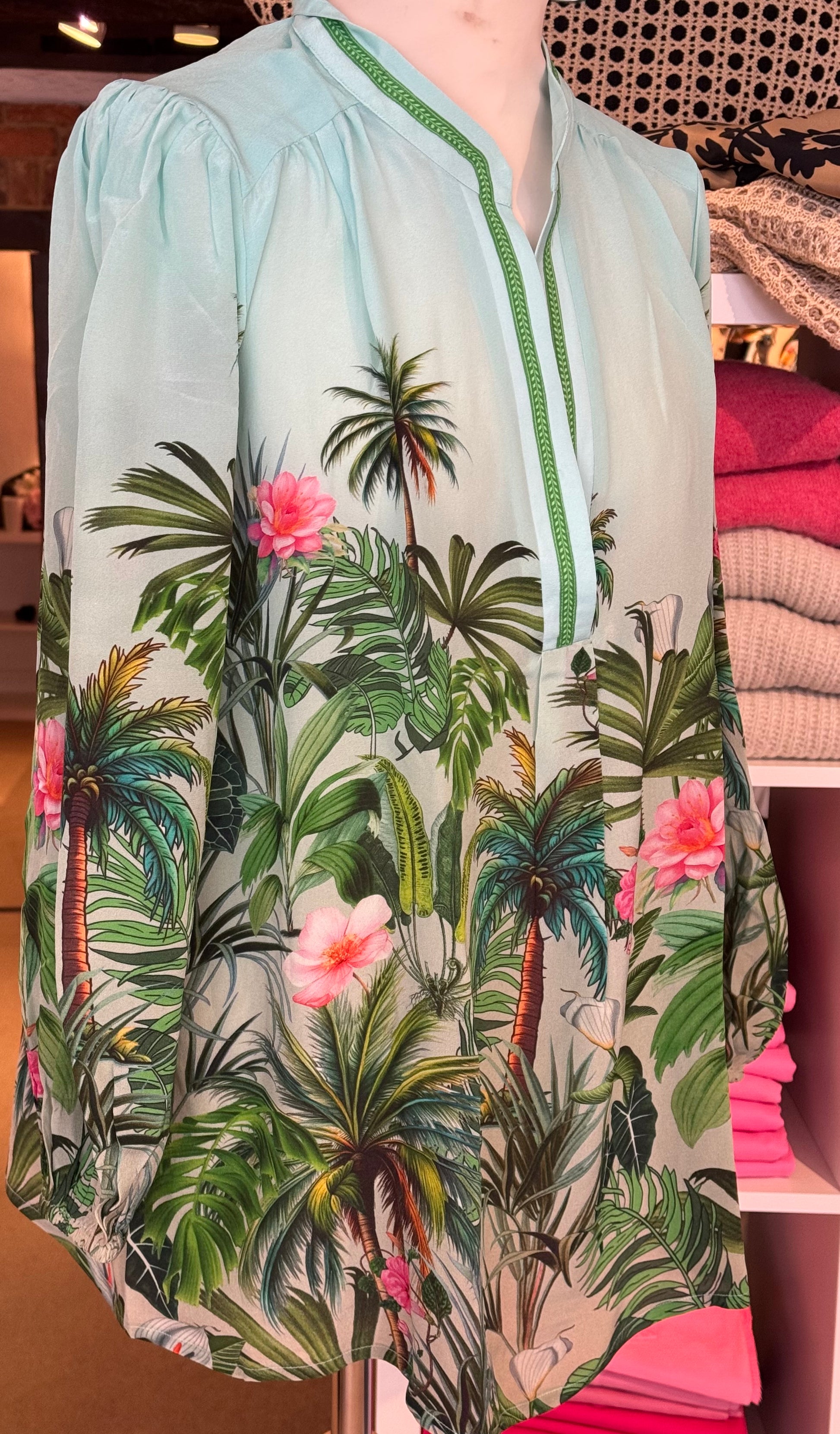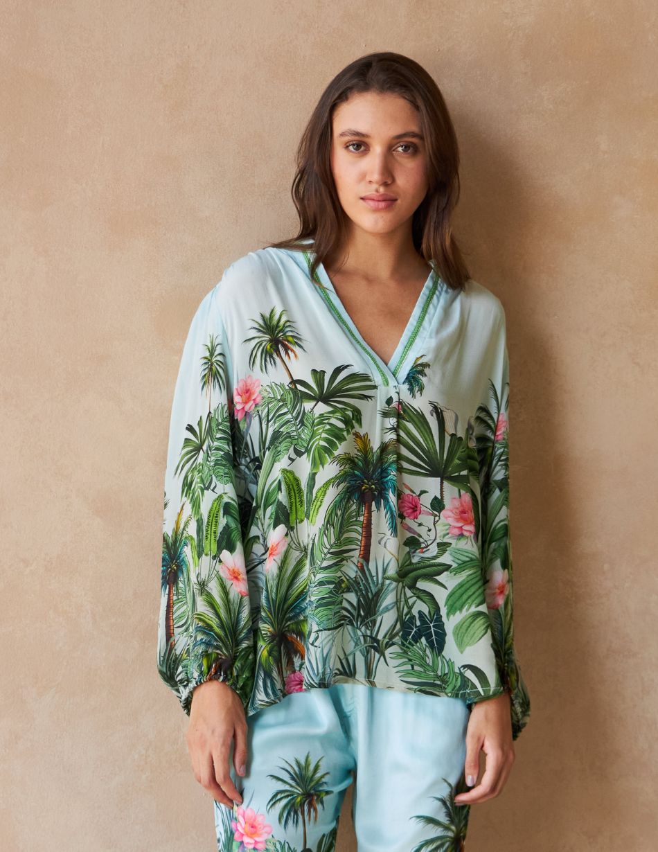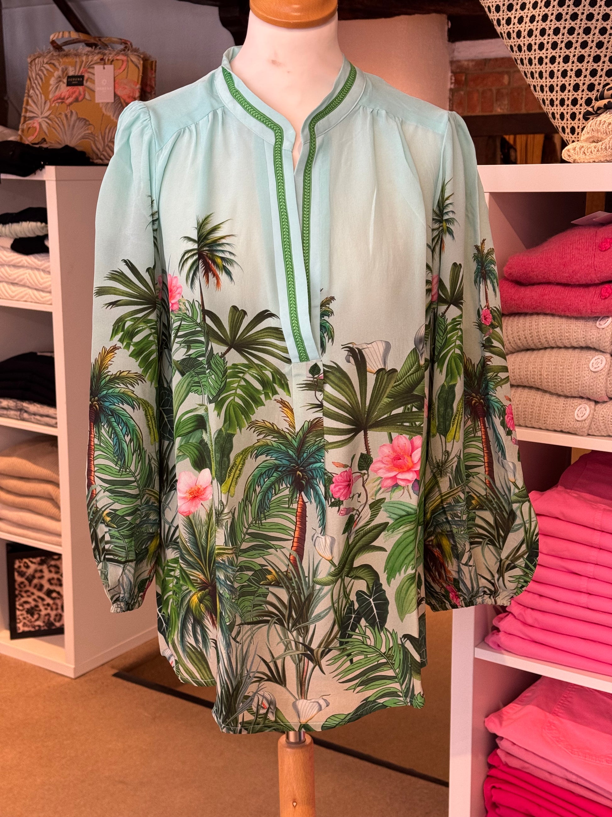 Tunic shaped top , deep V neck , with a low mandarin collar , long elasticated sleeves.