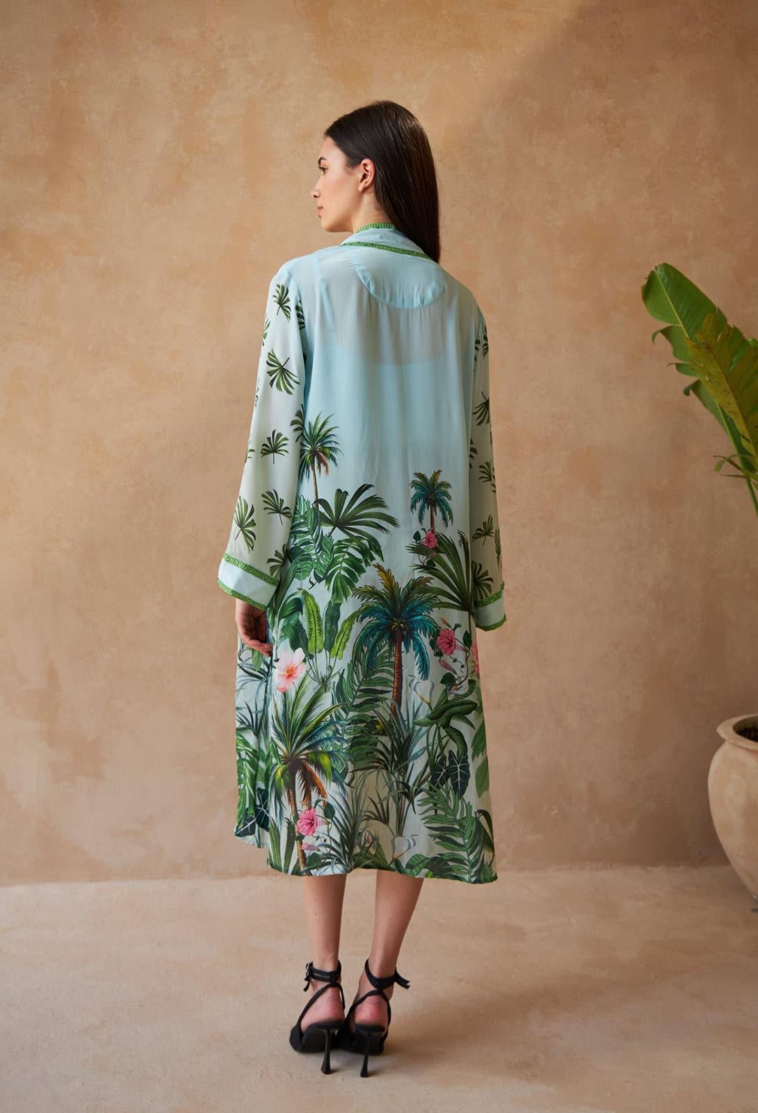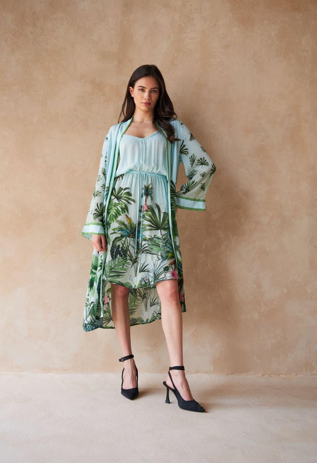 Rosemery Dress/Jacket in colour Palm green. Long, open dress in a beautiful palm print, detailed with small embellishments down the front, bottom hem and cuffs. Full, wide sleeves and two hidden pockets. Perfectly paired with a matching dress or a pair of full, white trousers.