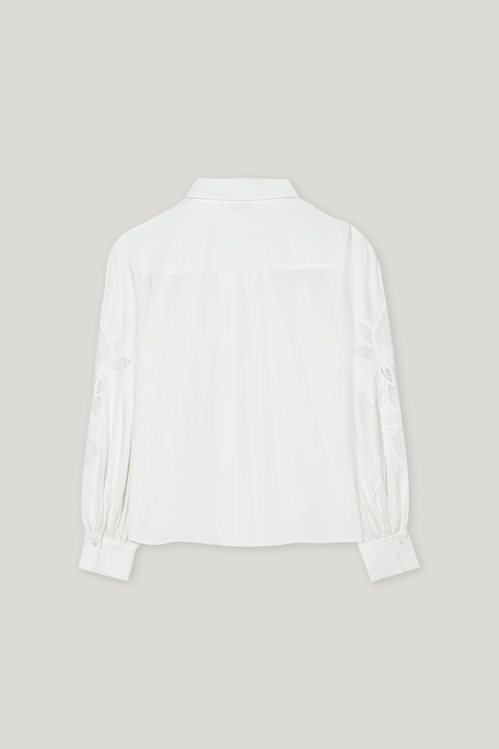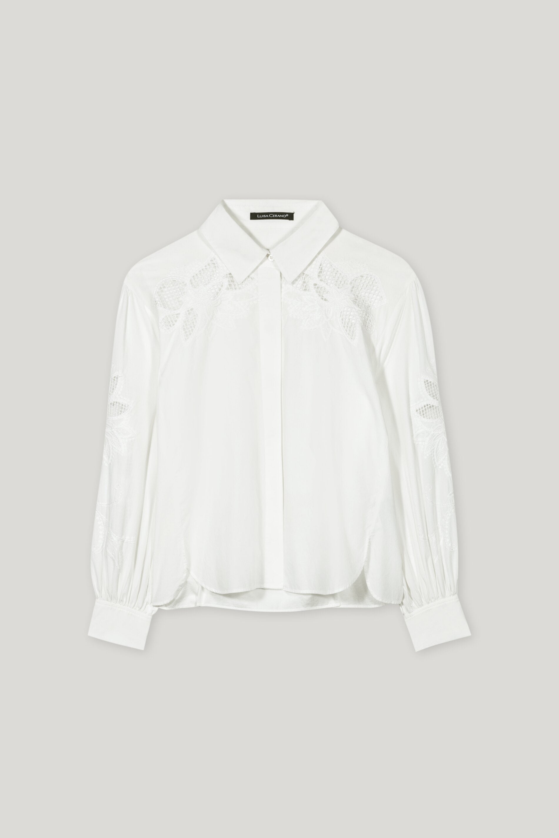 Luisa Cerano blouse with stunning lace, cutout detail. Featuring a classic collar and balloon style sleeves. Straight casual fit with a full button placket.