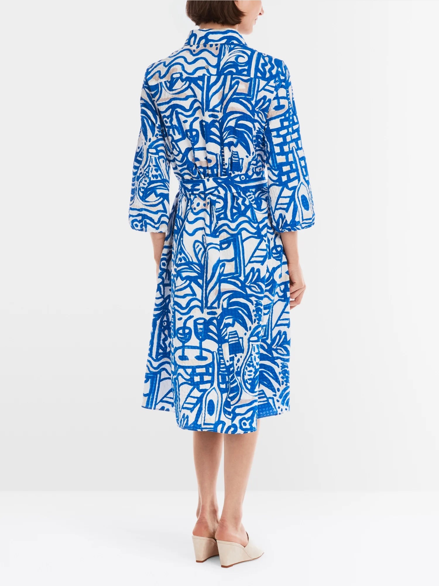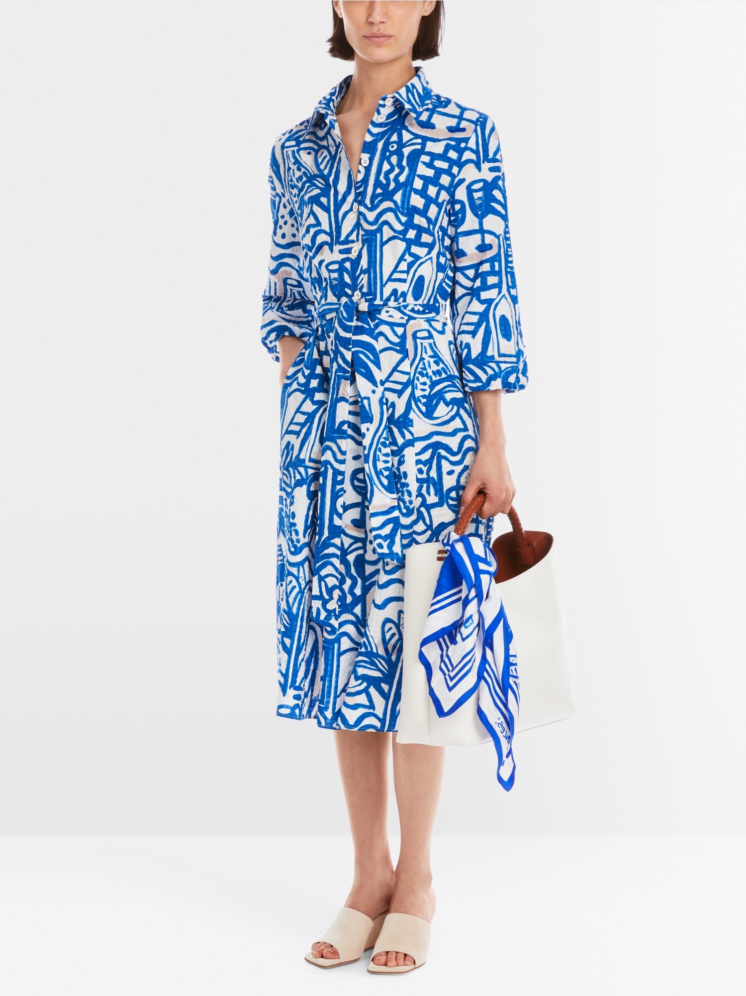“With its Francis print, it looks like a painted work of art from the south of France.” Made from textured cotton, it also impresses with its exclusive texture. This dress has a row of buttons, half-length sleeves and a classic collar. The knee-length skirt is flared. A tie belt gives the silhouette a fitted shape.