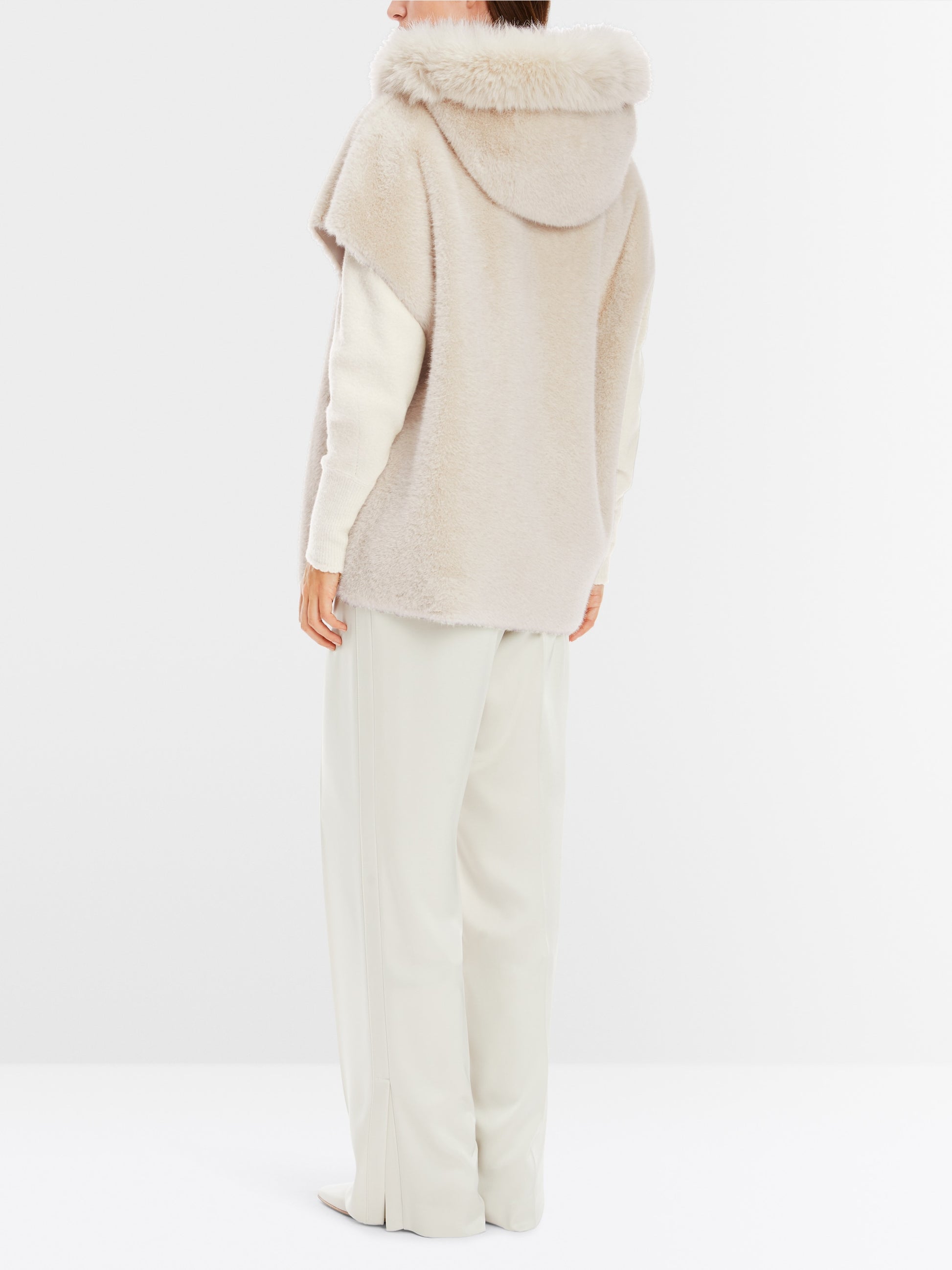 Vest for cool layering: this garment has an oversized cut and a straight shape with large armholes. The hood has a large cut and is trimmed with generous fun fur. The front features slanted welt pockets and a metal zip. The vest is unlined.