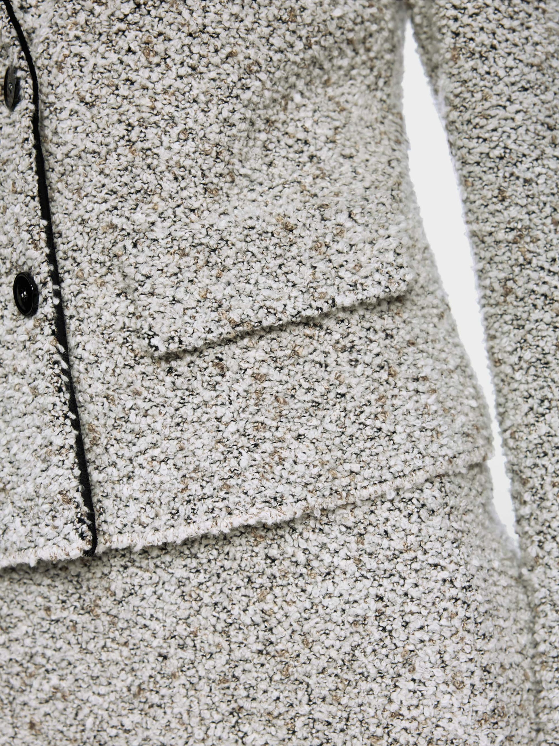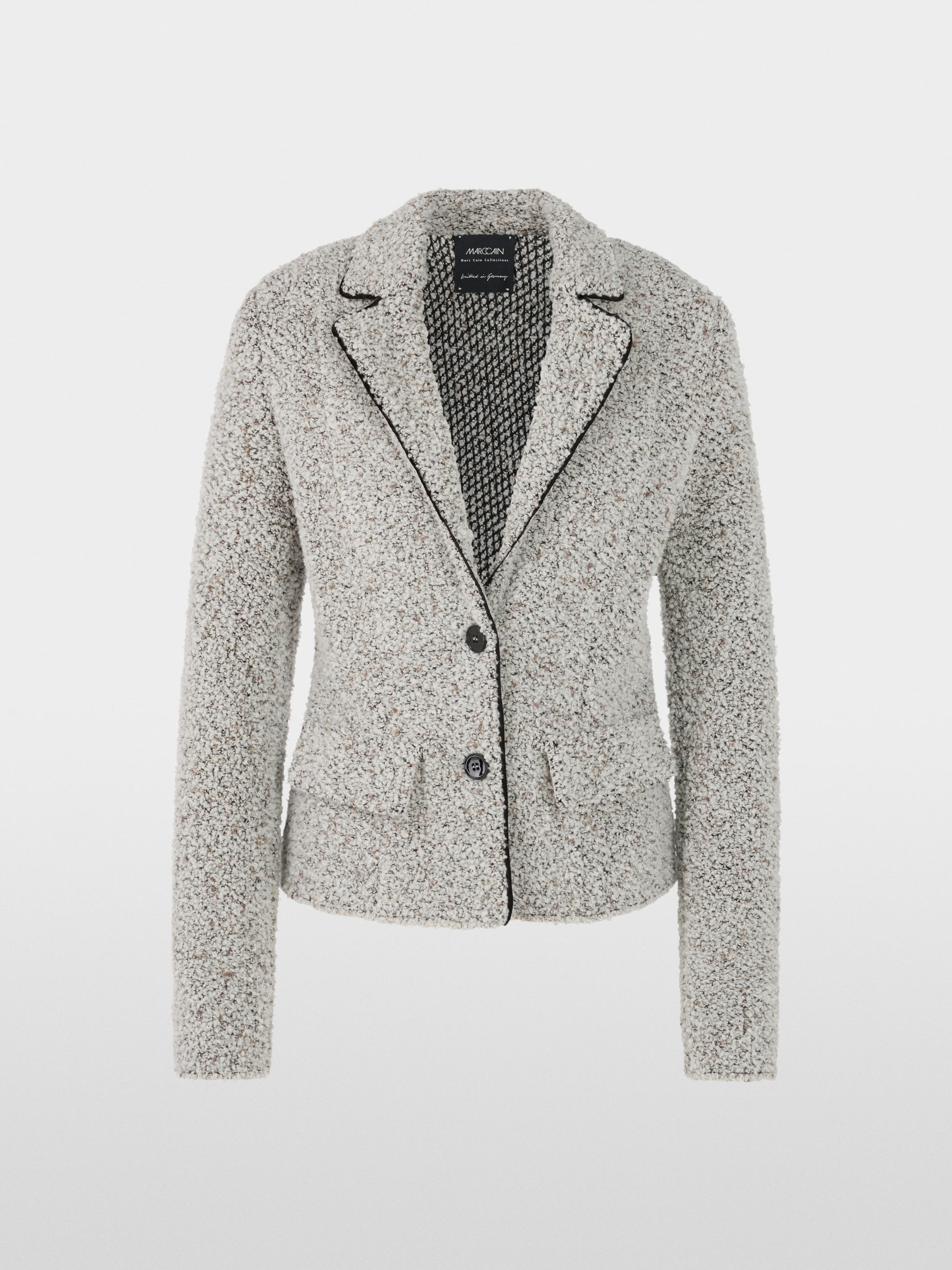 Made from a high-quality wool blend in a bouclé look, this blazer is tailored and features two buttons and contrasting piping. This garment is knitted and finished in Germany. The individual pieces are further processed in European partner companies. It is therefore Knitted in Germany.