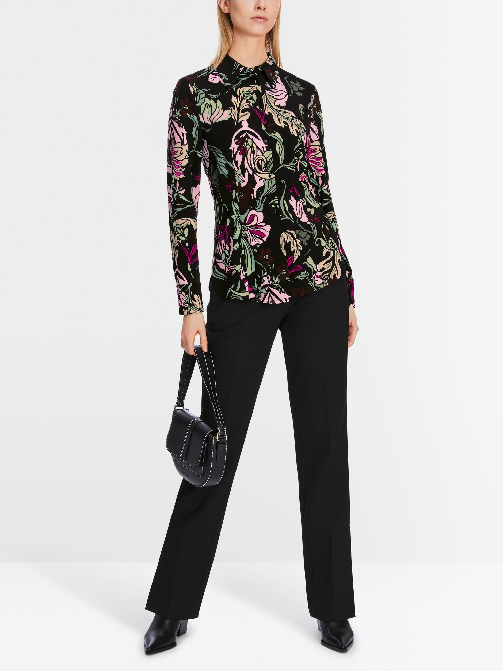 The lush floral print on this blouse is sure to catch the eye. It features a figure-hugging shirt blouse cut with a collar and cuffed sleeves. The placket features square pearl buttons. The hem has a rounded shape