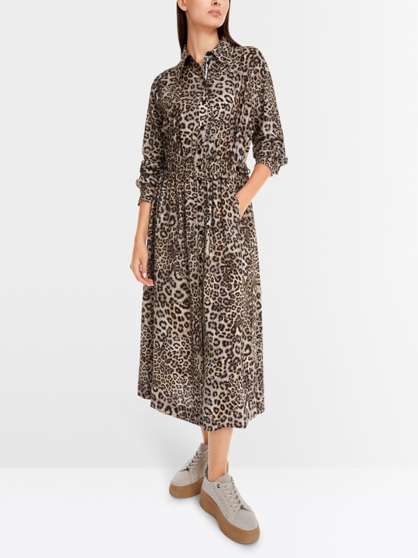 Soft-flowing shirt dress in leopard print. This garment has a Kent collar and a full-length row of buttons. Its width can be adjusted at the waist with a drawstring. Additional details include the seam pockets and hem slits. This dress is primarily made from recycled viscose and therefore has the Rethink Together sustainability label.