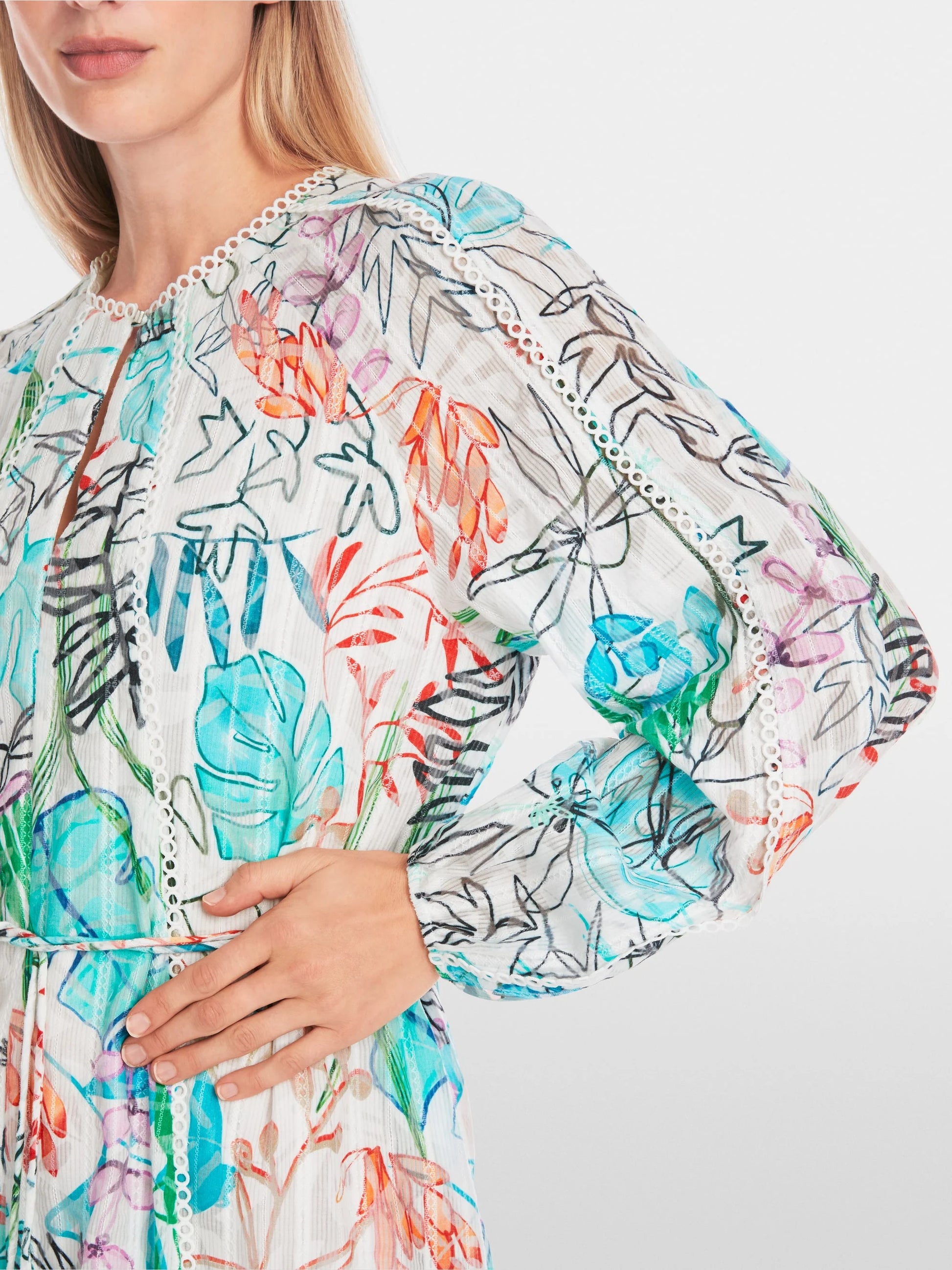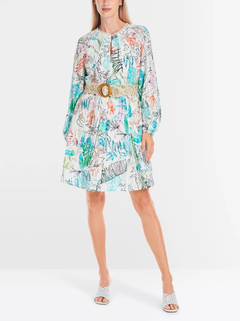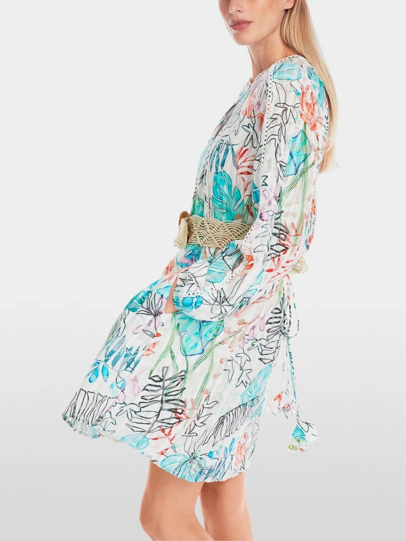 iI"..c Cain Leaf dress has a wide silhouette with a round neck and further detailed with a ruffle hem and a delicate tie waist. The beautiful wide sleeves then finish with an elasticated cuff.