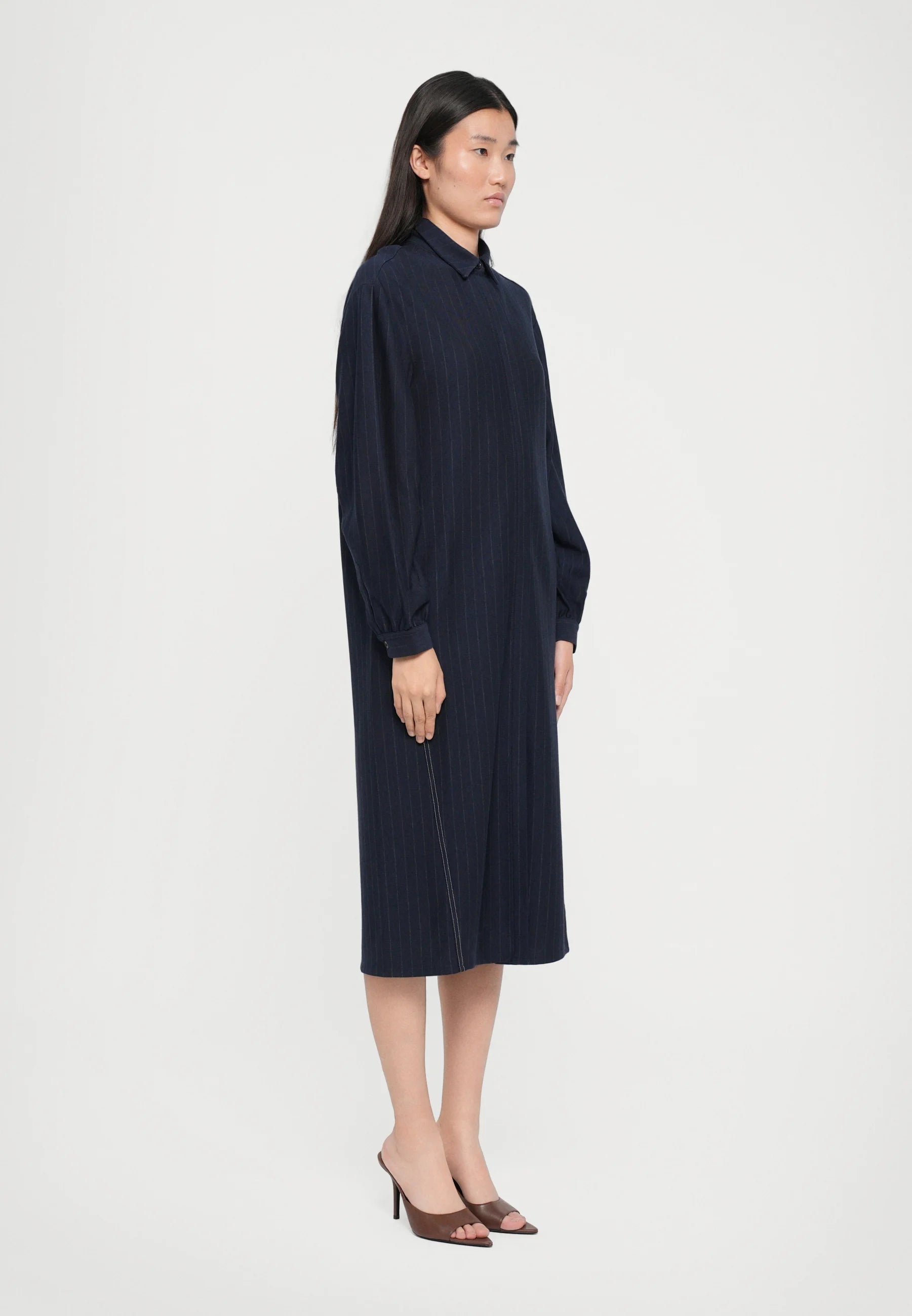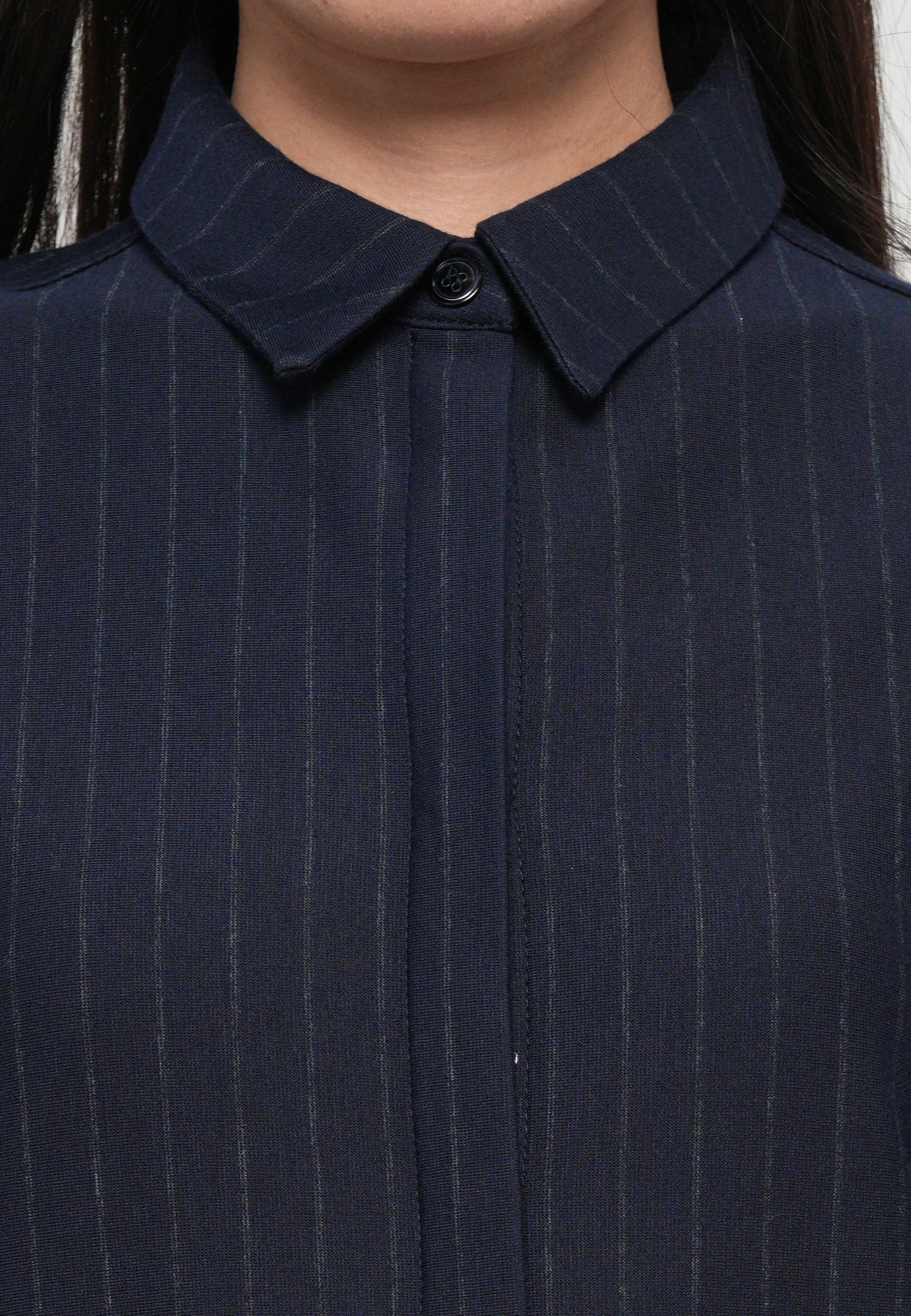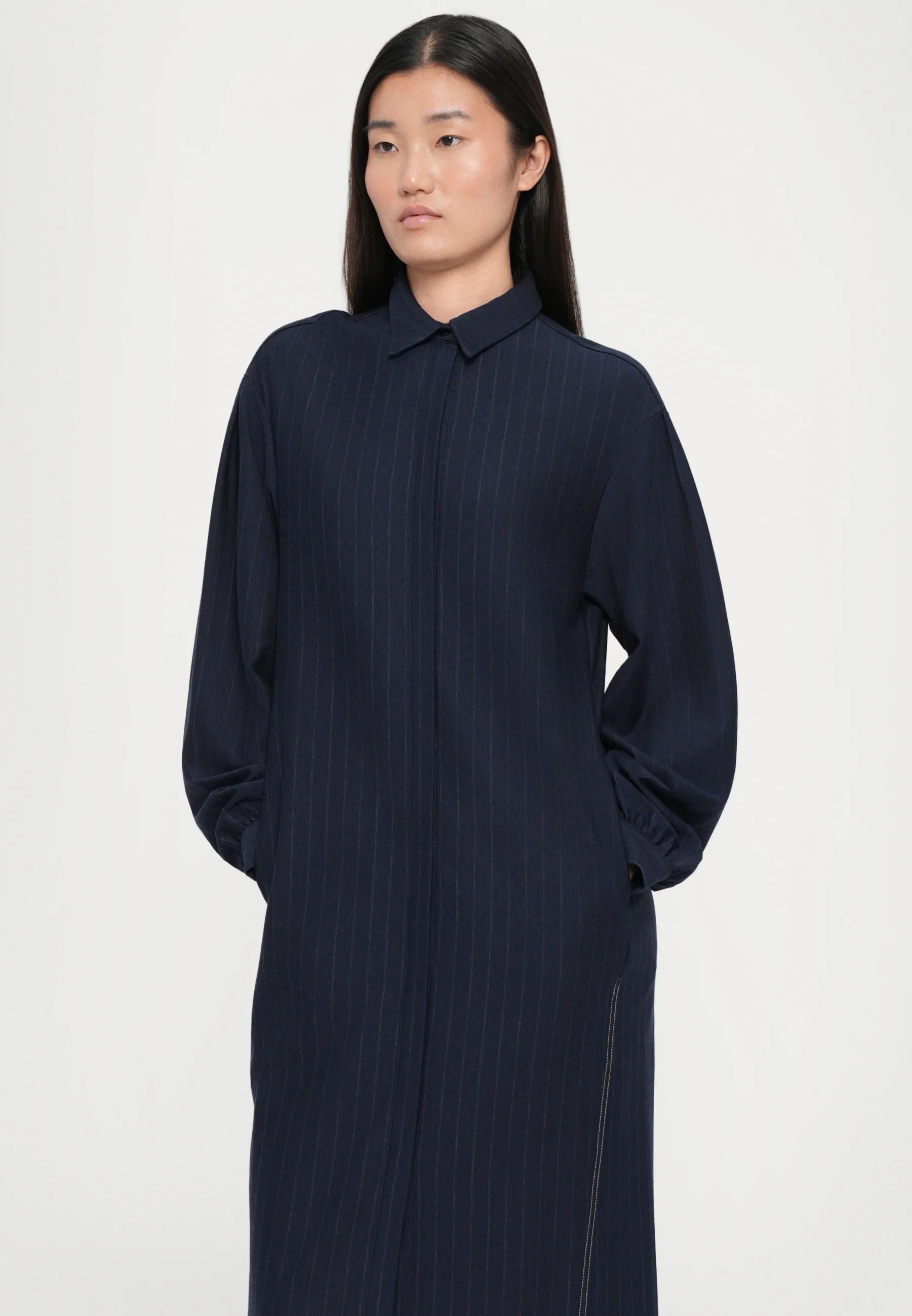 Navy pinstripe, mother-of-pearl buttons, turn-down collar. Fits small.