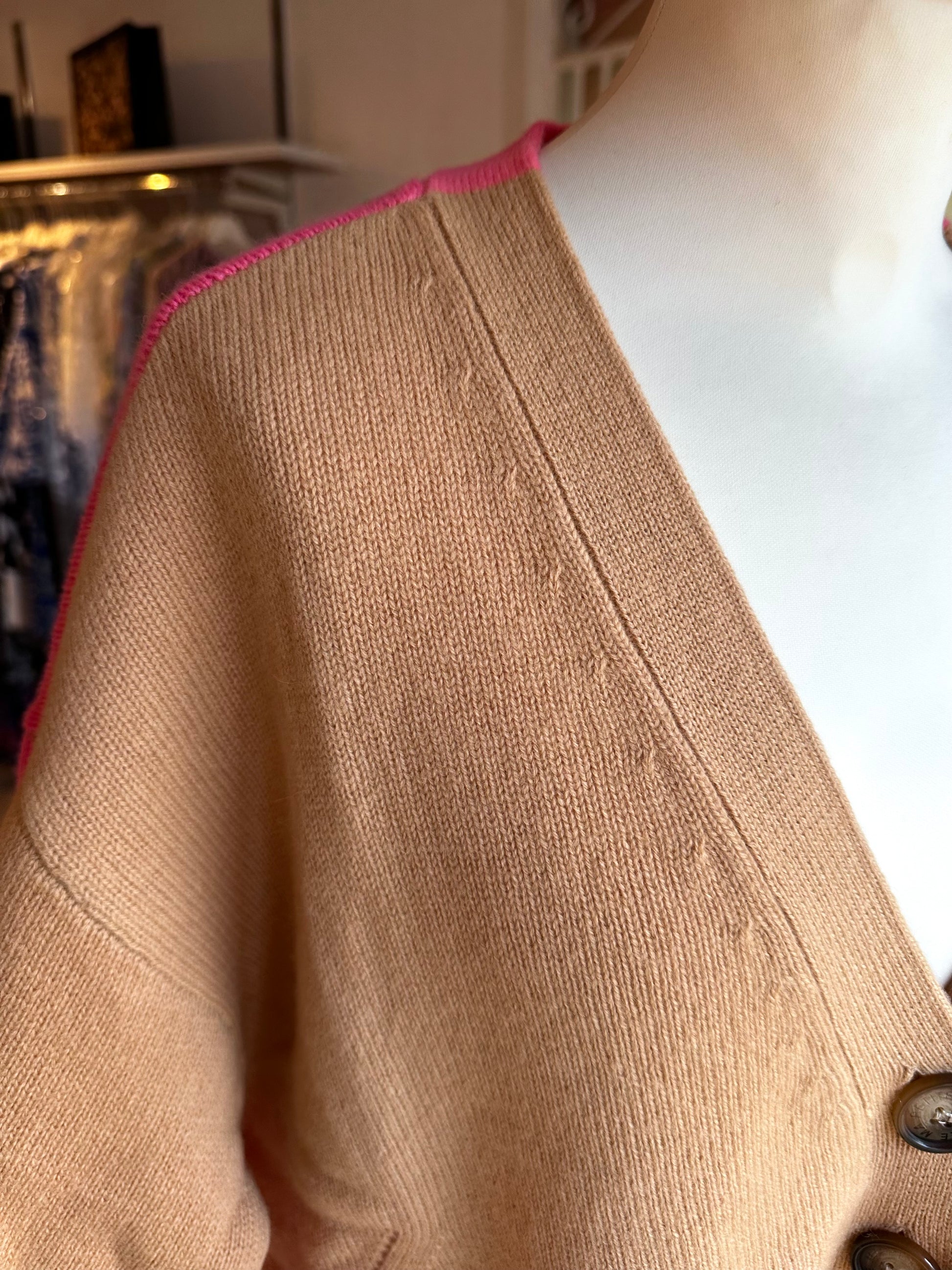 This stylish piece features a warm camel front with bold pink accents on the back and sleeves—perfect for adding a pop of colour to your look. Designed with a deep V-neckline, front pockets, and oversized buttons, this cardigan combines comfort and modern flair. Ideal for layering over your favorite basics for a cozy yet eye-catching outfit.