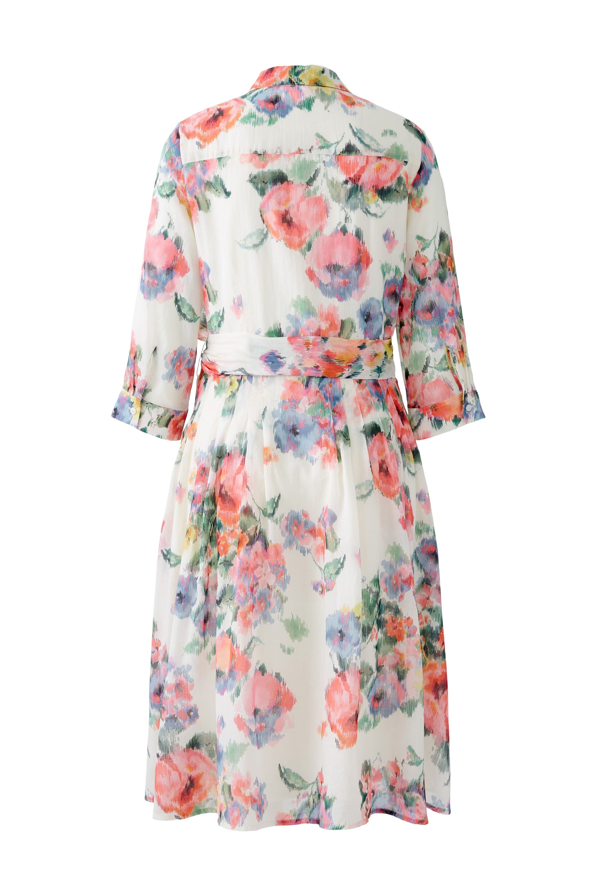 Oui midi dress in a stunning pink and green, floral print. Featuring a classic shirt collar with a fitted top and full skirt. This dress has half length sleeves and a matching belt to tie at the waist.