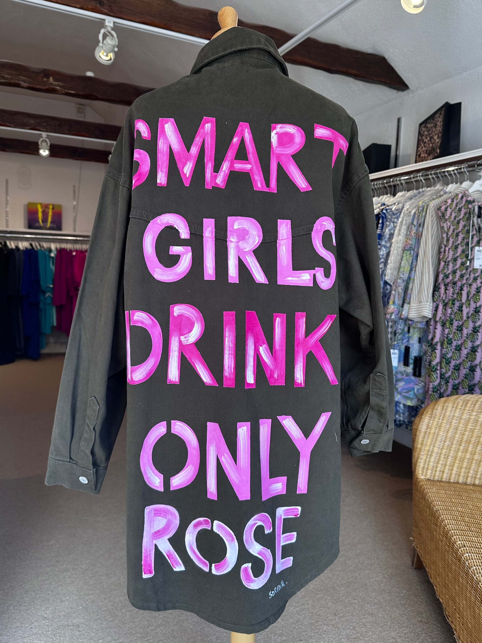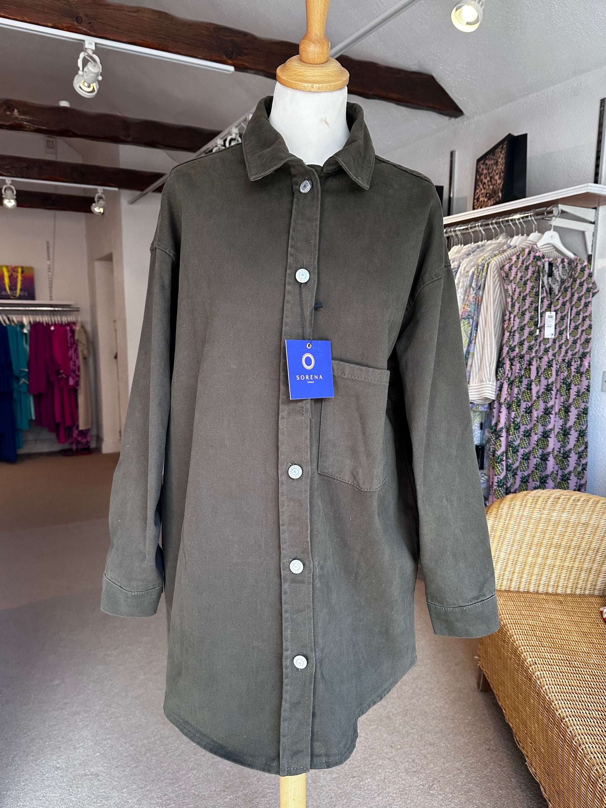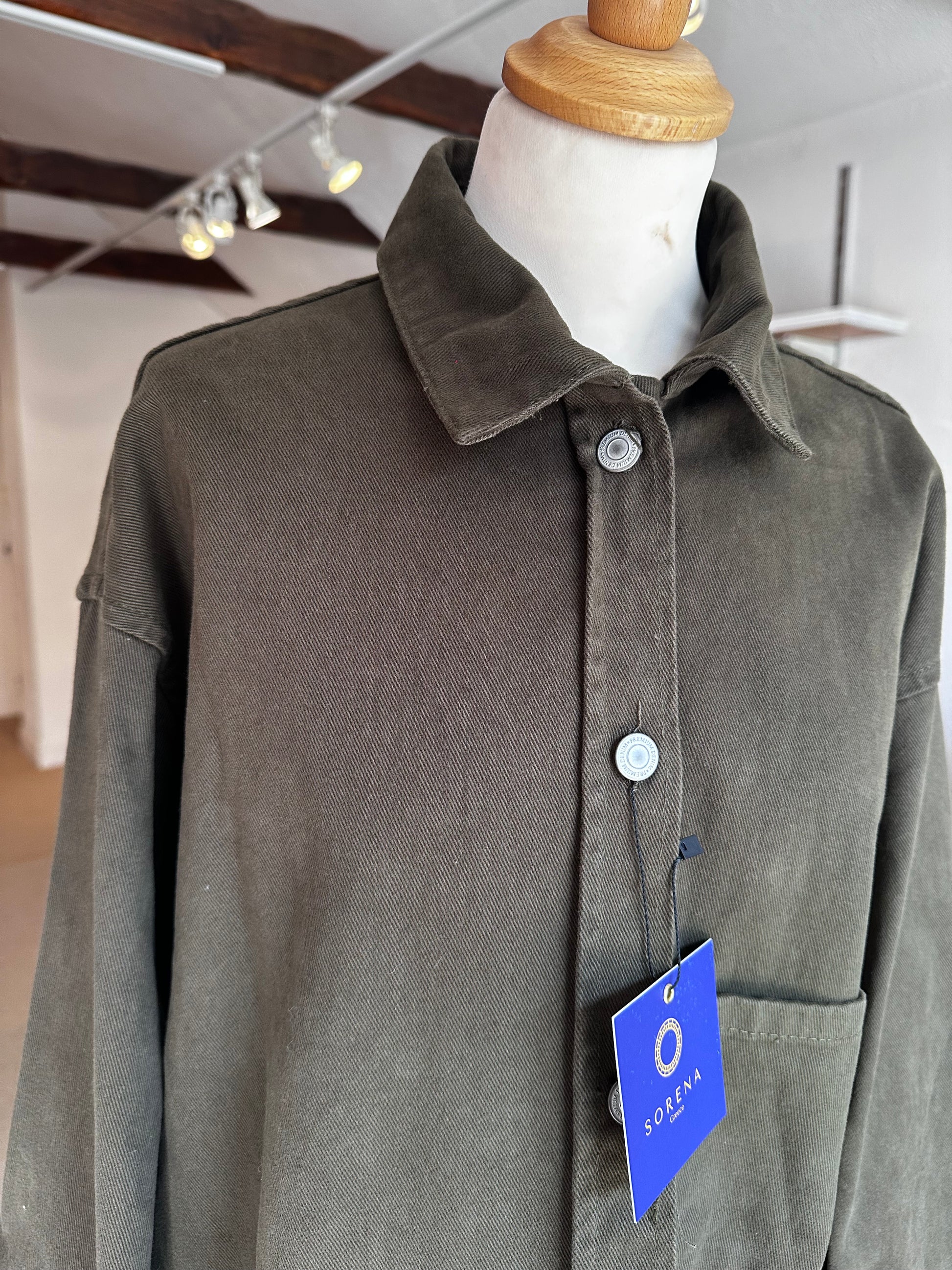 100% cotton denim, in a soft khaki. Due to the hand painted nature, this garment needs to be hand washed in cool water to prevent cracking.