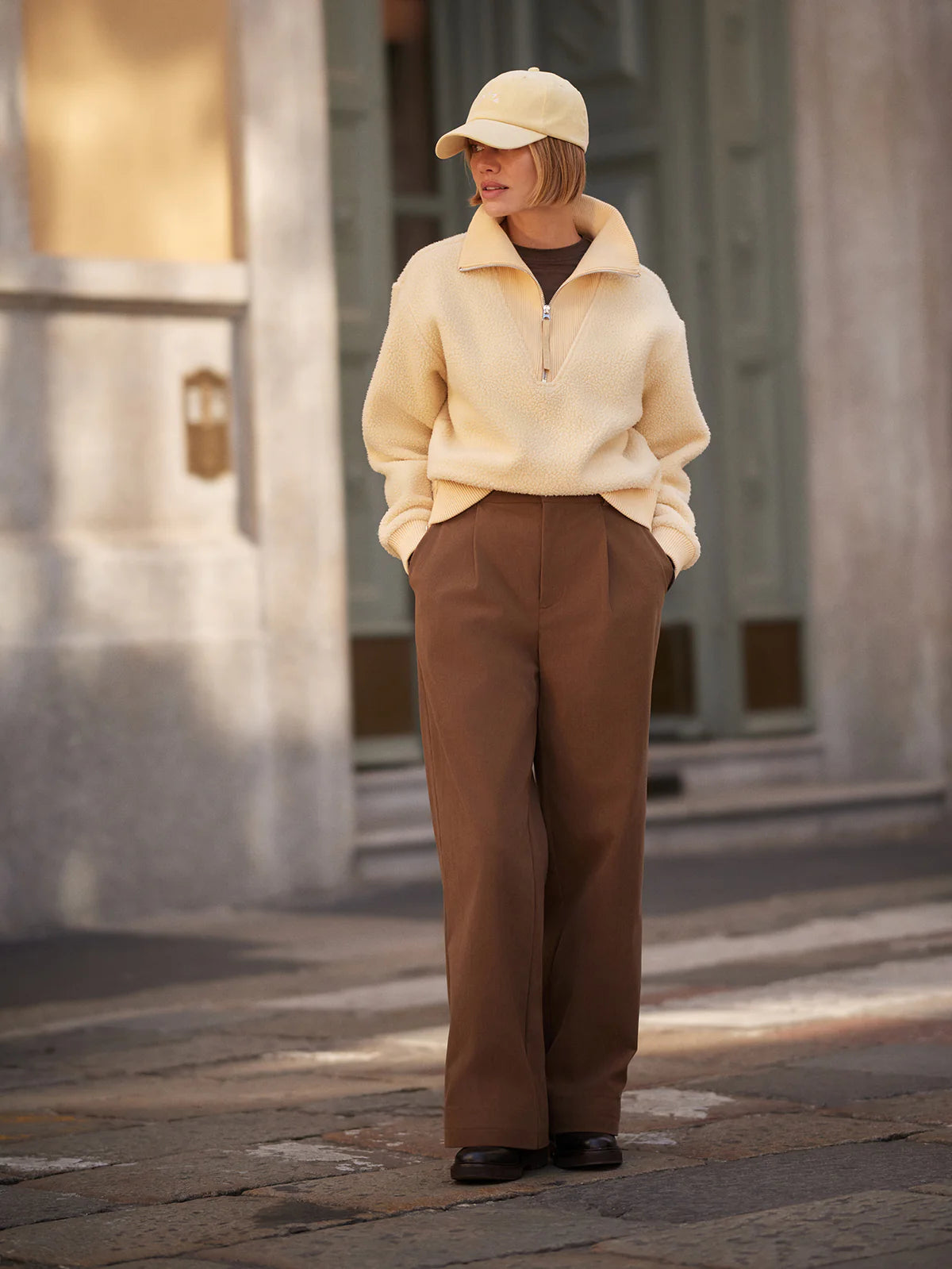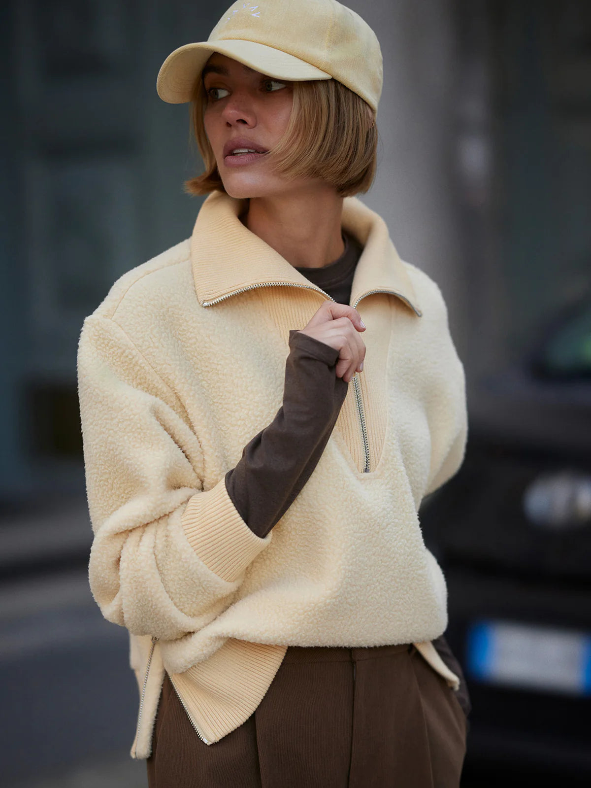 The Jaylin half-zip is crafted from a soft Plush Borg Fleece and cut to a relaxed fit - perfect for layering over your transitional looks or lounging in the winter months. The ribbed hem, cuffs, and the V-shaped rib panel around the collar add extra texture, while side zips at the hem set a subtle accent