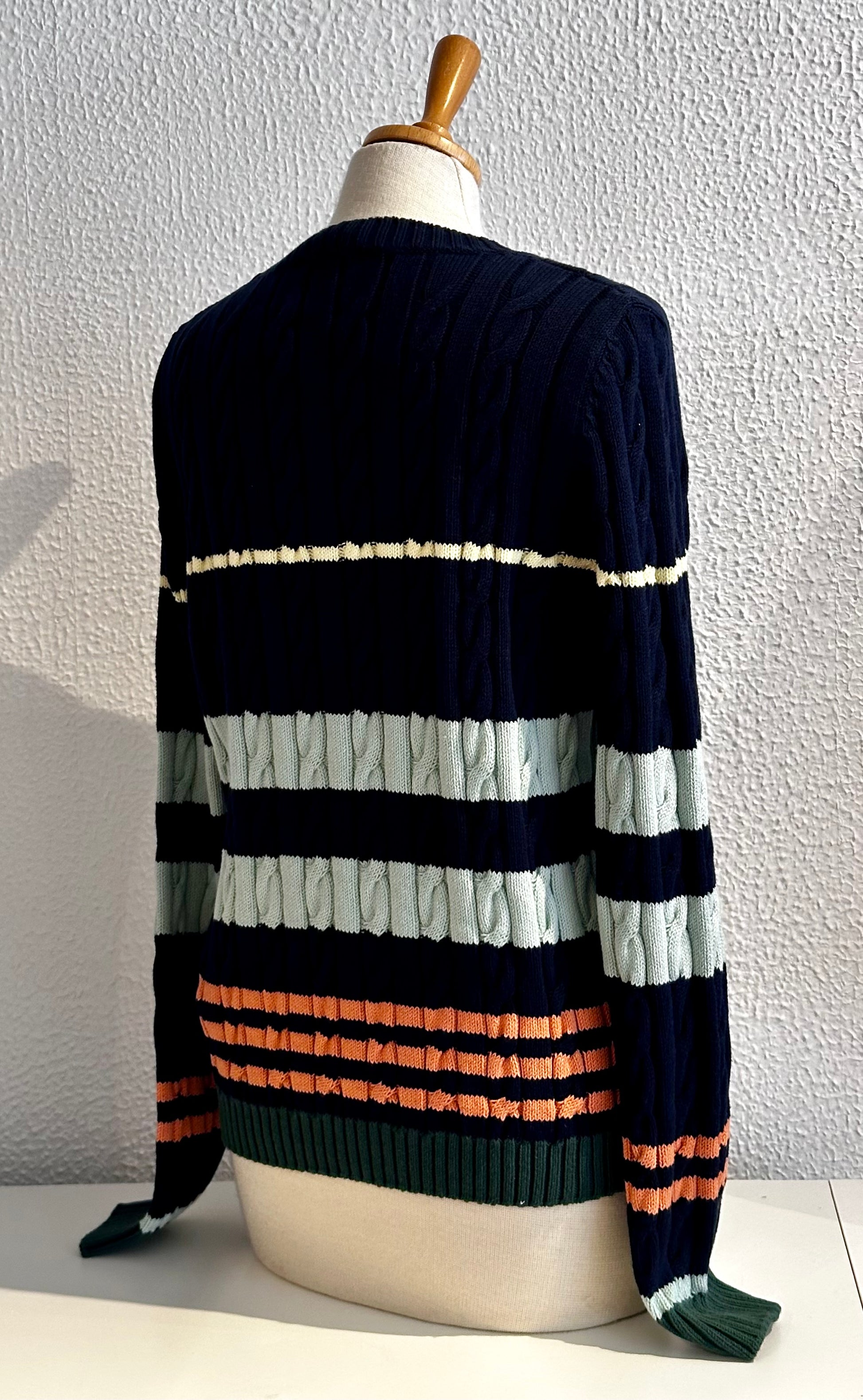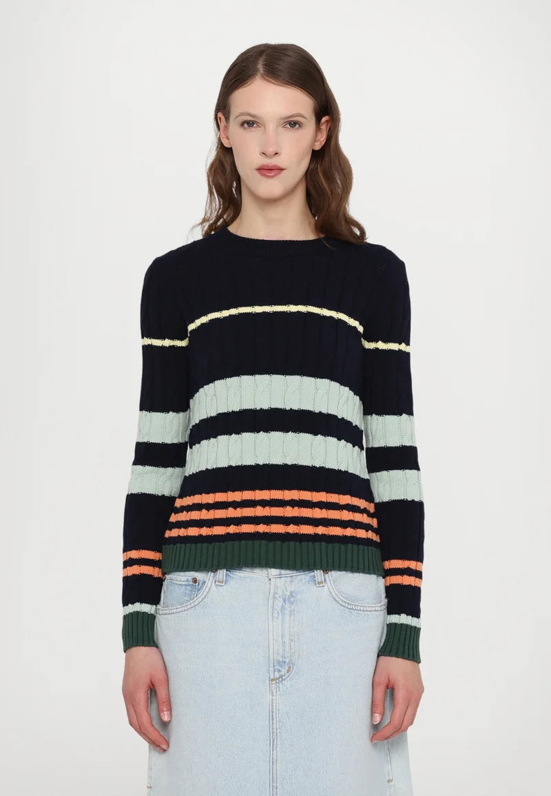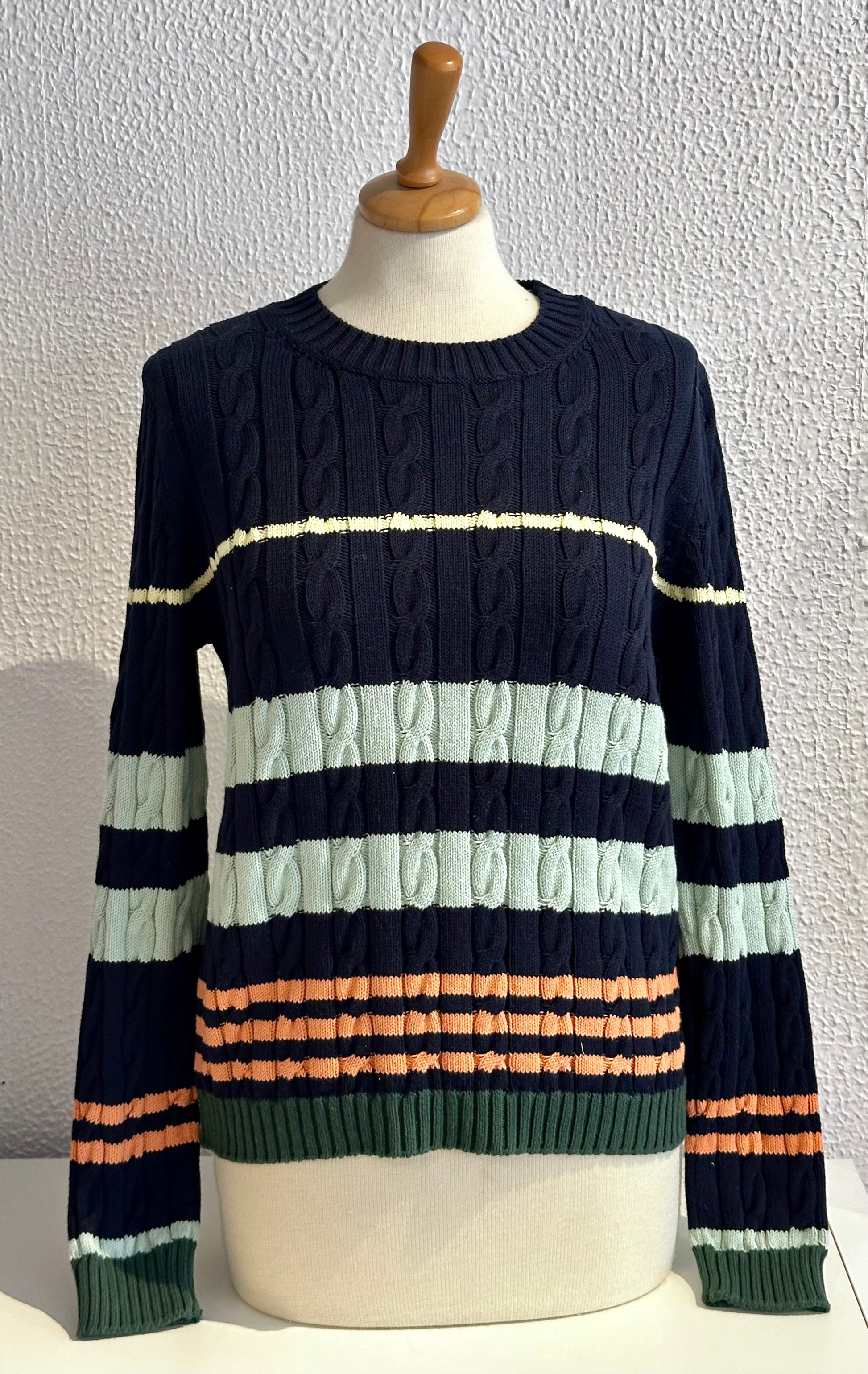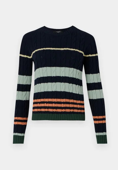 Stylish cable knit jumper from Weekend MaxMara in Navy. Slim fit with a round neck and long sleeves. Featuring Contrasting stripes all over.SLIM FIT